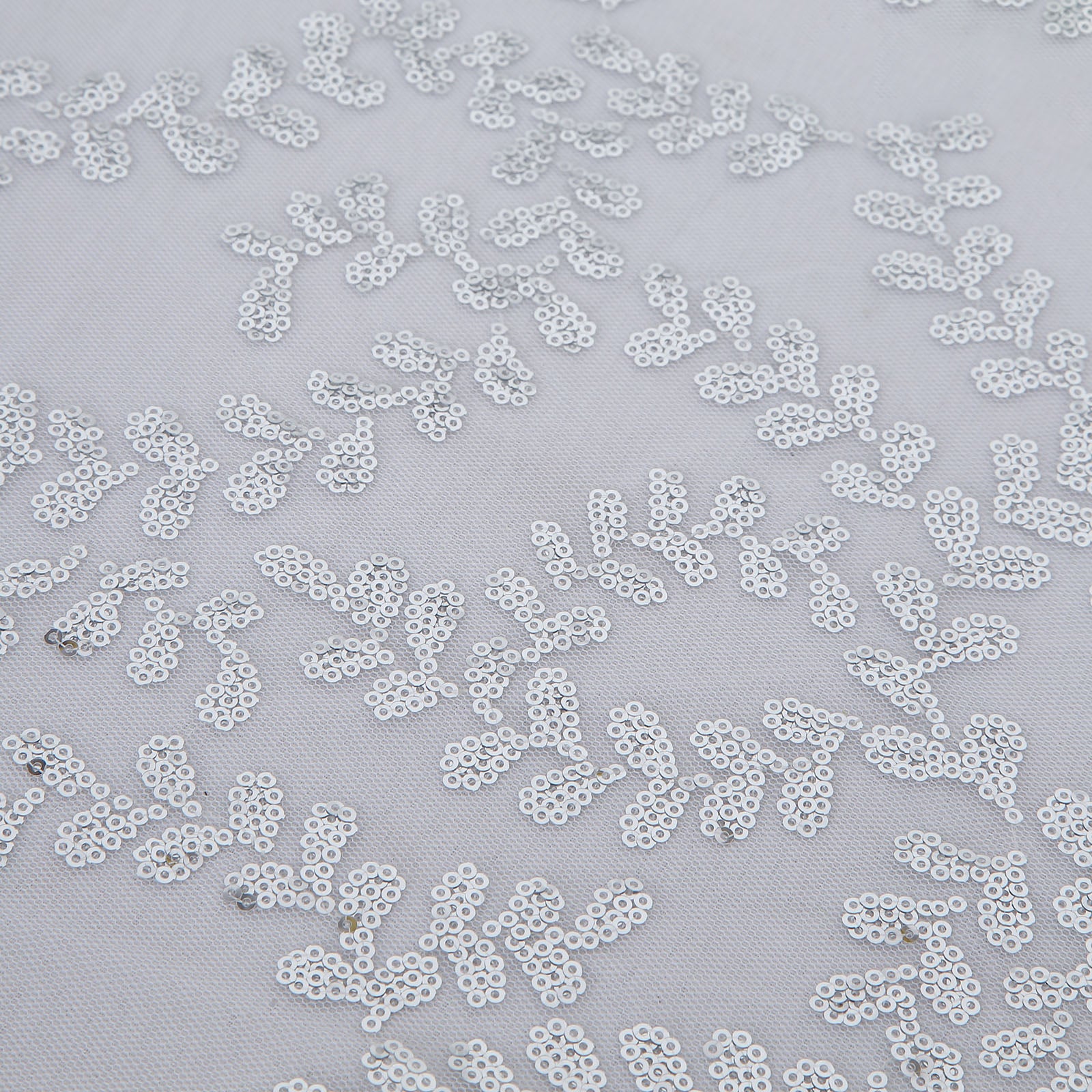 The Silver Sequin Leaf Embroidered Tulle Tablecloth is a stunning centerpiece. Its intricate leaf vine pattern captivates attention. Shimmering silver sequins dance across the sheer tulle fabric, creating a magical effect.