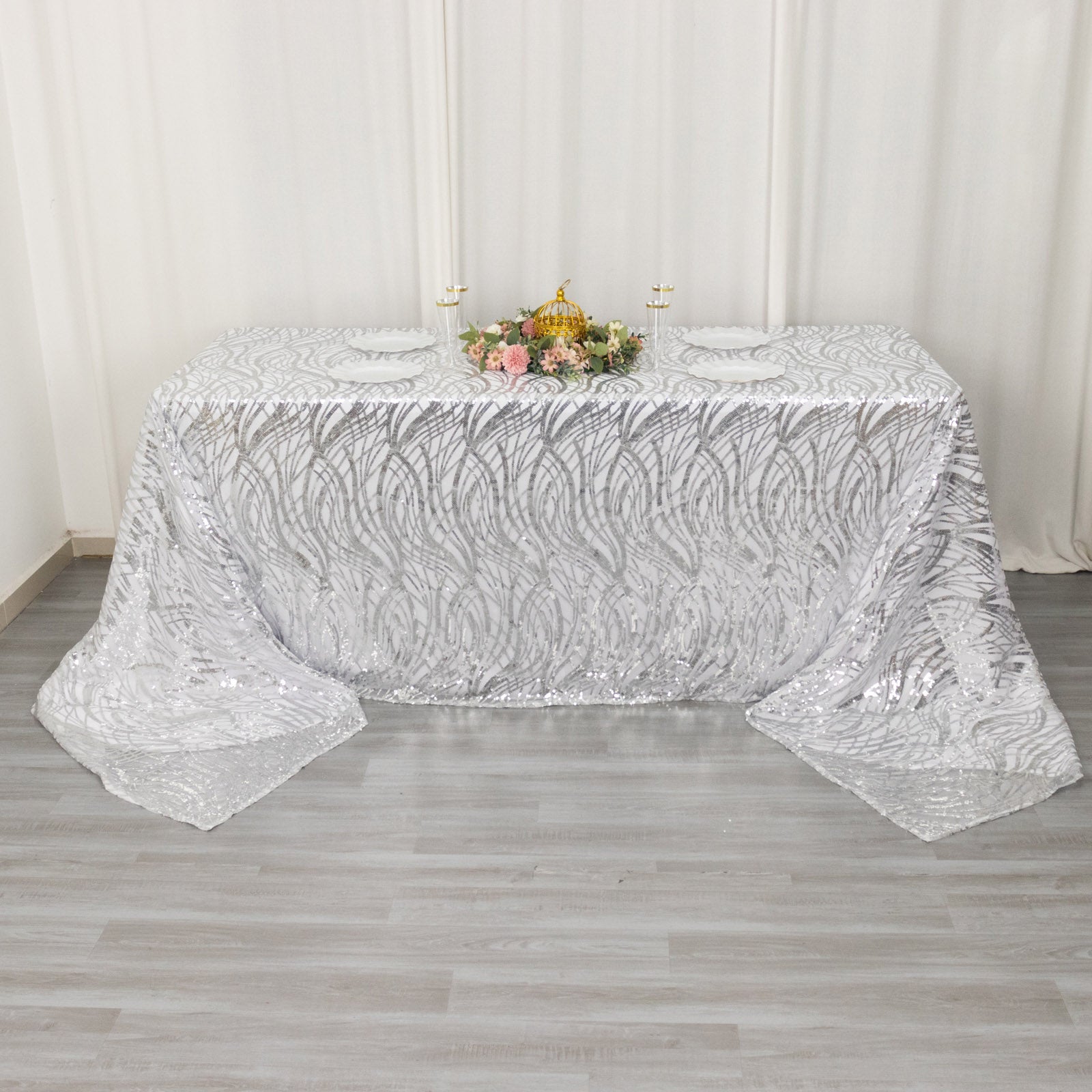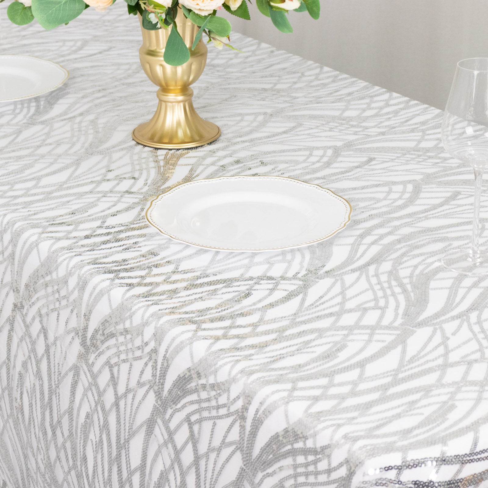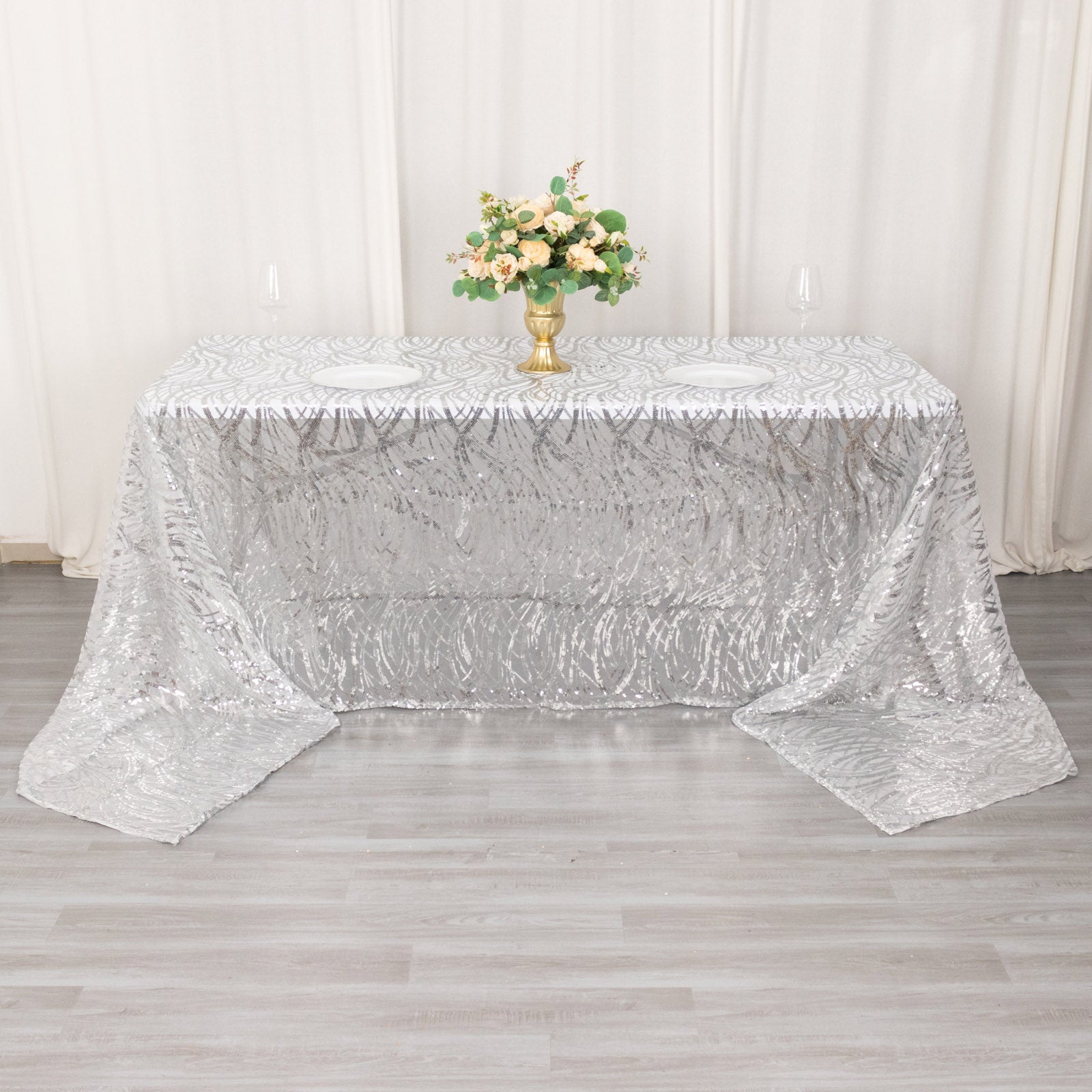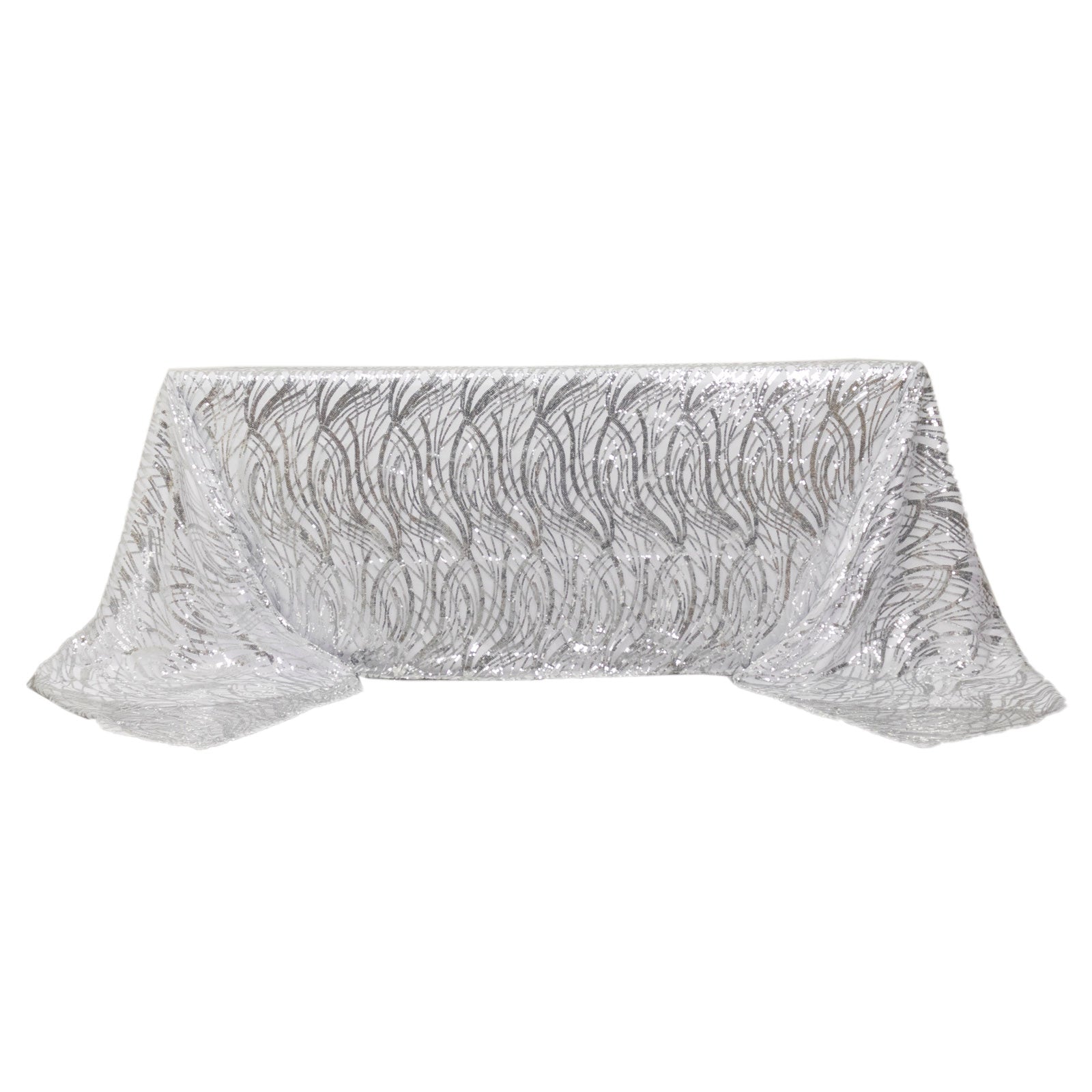 90"x156" Silver Wave Mesh Rectangular Tablecloth With Embroidered Sequins
