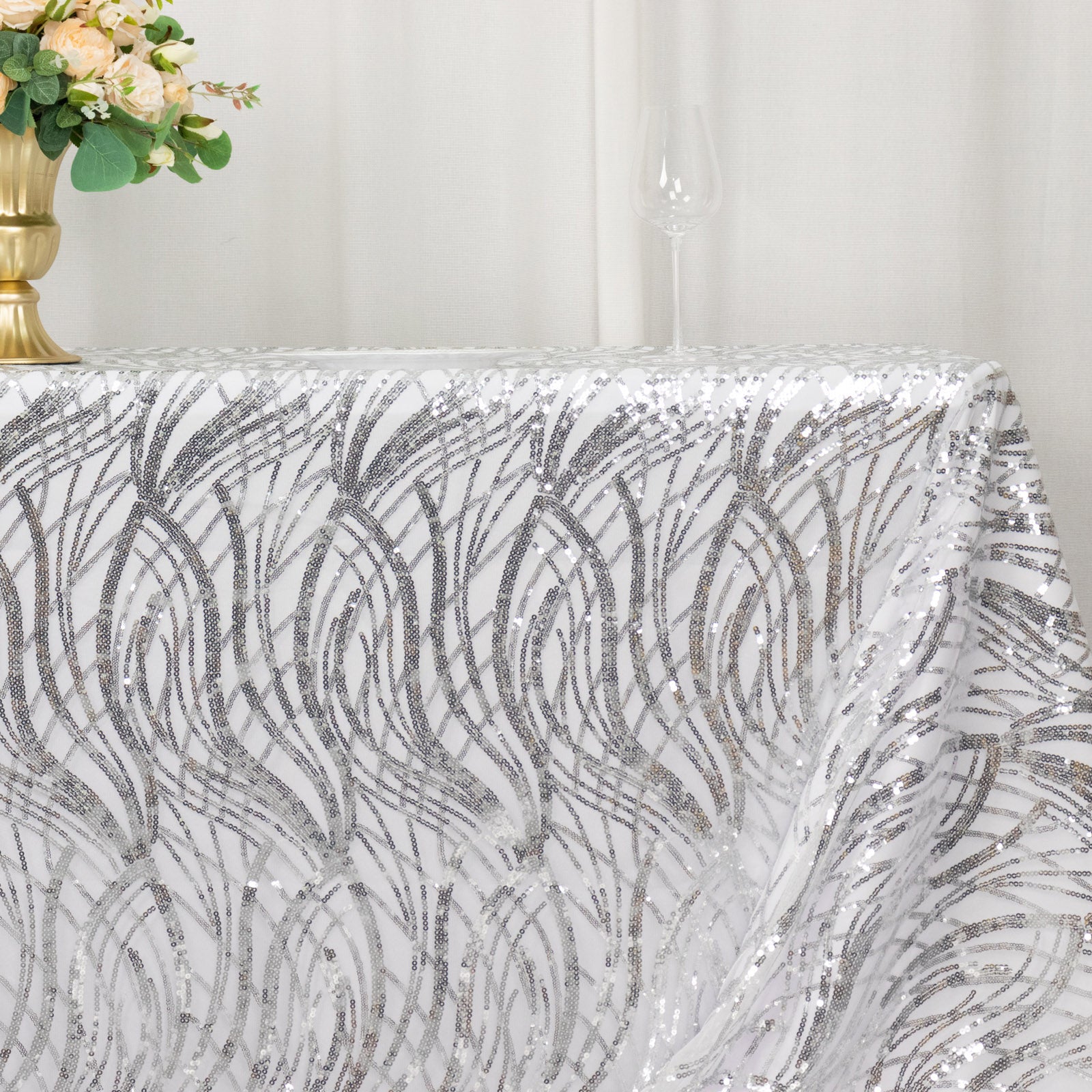 The Silver Wave Mesh Rectangular Tablecloth redefines elegance. Its stunning design features a unique wavy sequin pattern, perfect for creating a luxurious atmosphere at any event.
