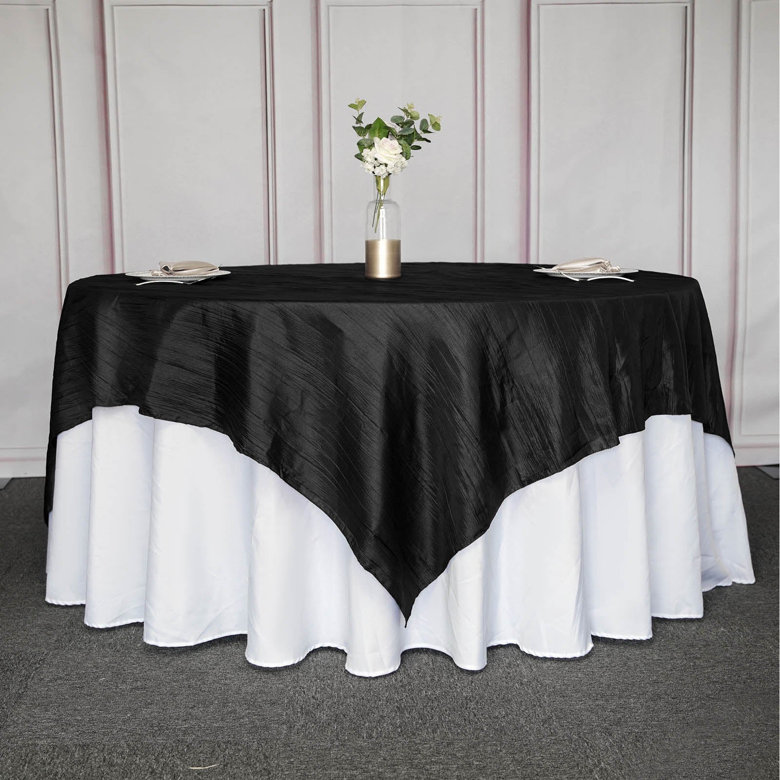 Our Black Accordion Crinkle Taffeta Square Table Overlay is not just stylish, but practical too. Measuring 90"x90", it provides ample coverage for larger tables. This makes it ideal for any event.