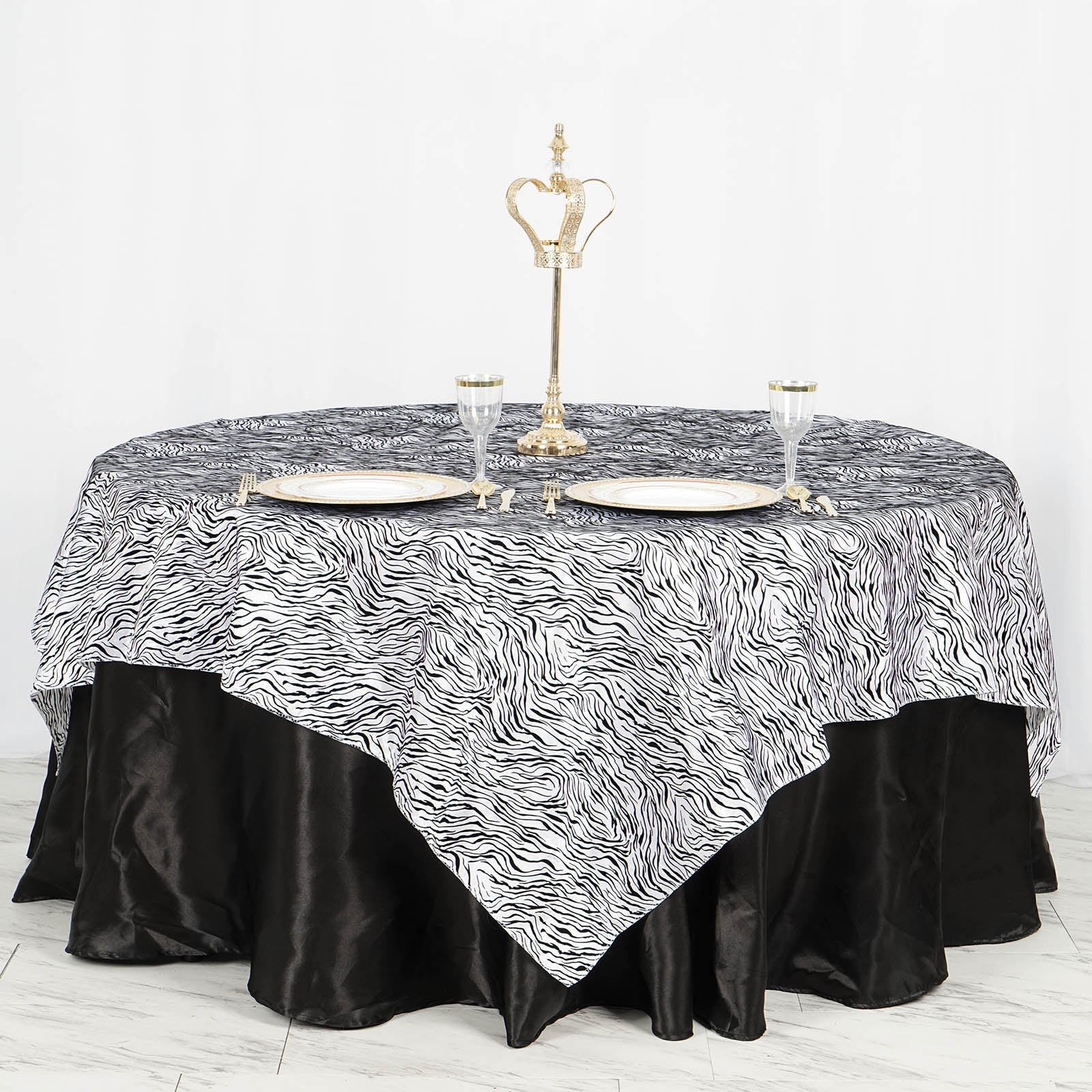 90"x90" Black and White Tiger Print Taffeta Square Table Overlay, Jungle Theme Party Decoration