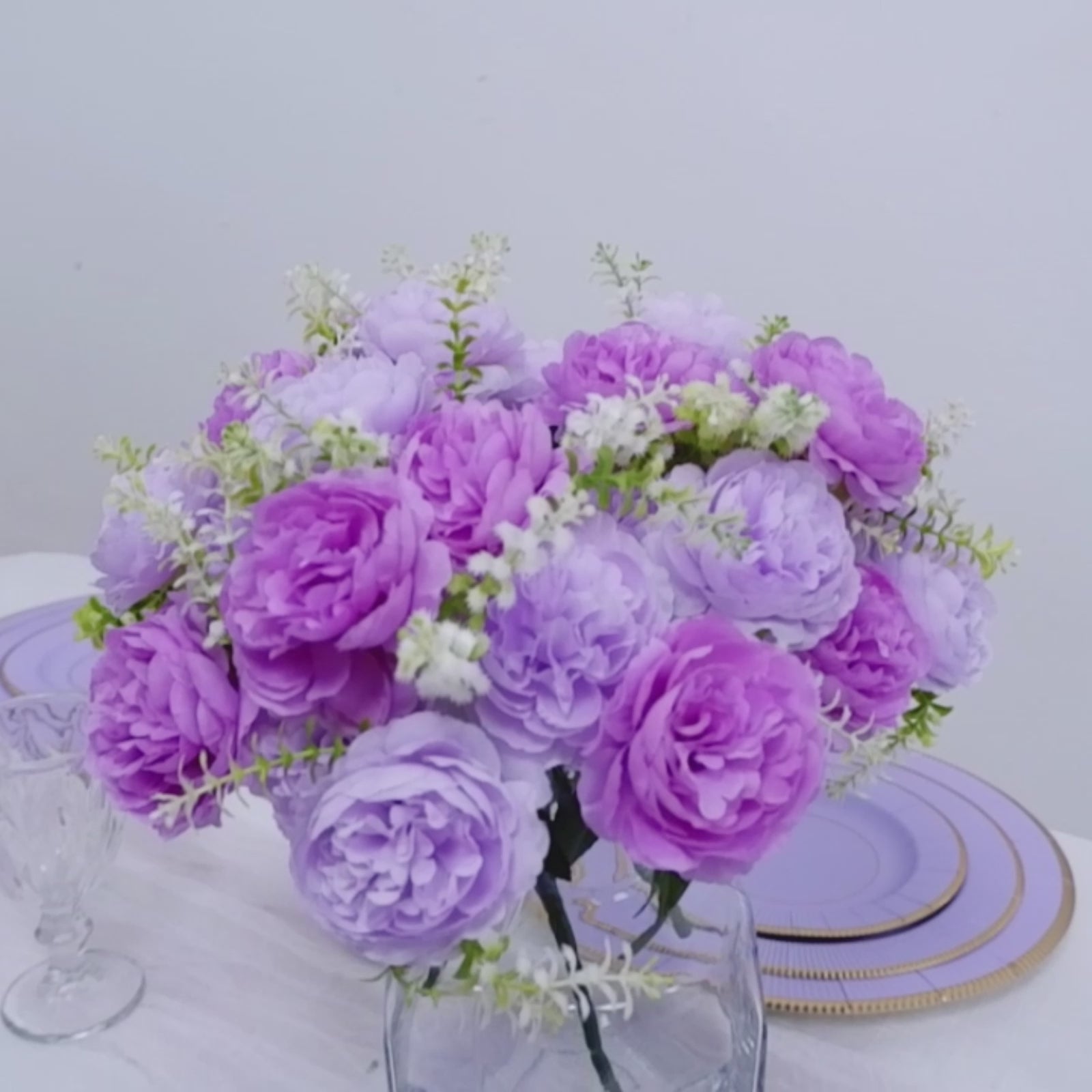The peonies in this bouquet are made from high-quality silk petals, giving them a soft, realistic appearance. The flowers are arranged with precision, ensuring that they capture the essence of fresh peonies without the hassle of maintenance. Their rich Lavender Lilac tones are perfect for complementing wedding themes, parties, and various home decor styles.