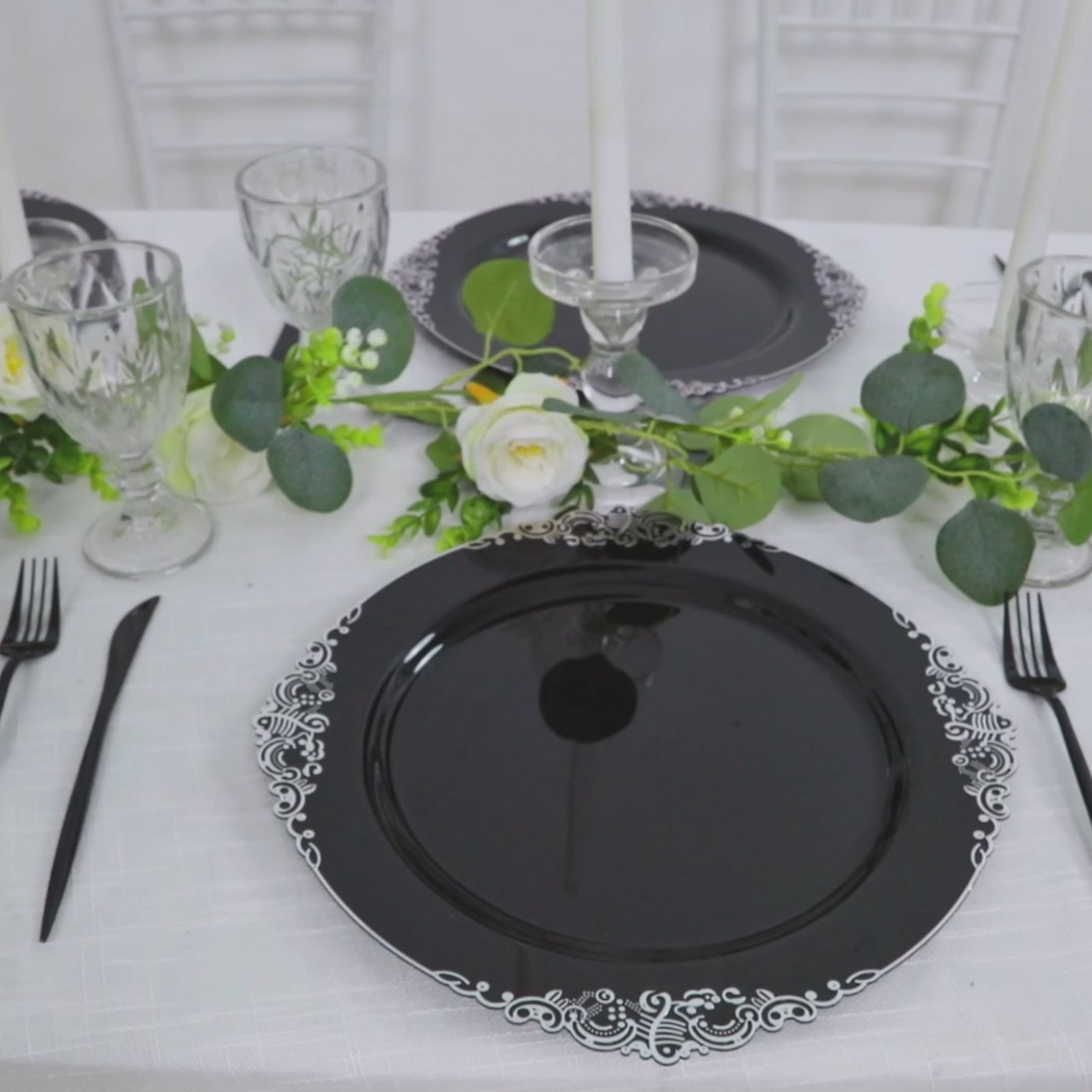 20-Pack Economy Plastic Charger Plates 13" Round Black with Silver Embossed Baroque Rim