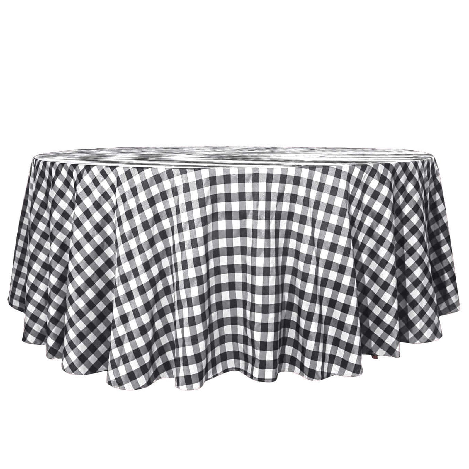 Create a memorable atmosphere by pairing this tablecloth with matching table overlays, napkins, and other décor items. The White/Black Buffalo Plaid Round Tablecloth's versatility ensures it will complement a variety of event themes and color schemes. Its timeless design and durable construction make it a valuable addition to your event décor collection.