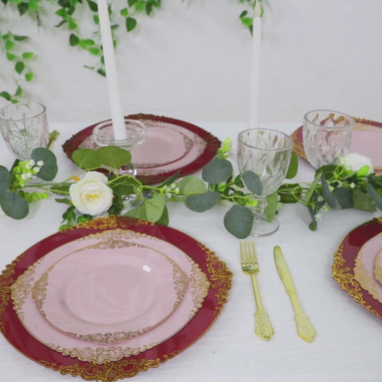 20-Pack Economy Plastic Round Charger Plates 13" in Burgundy with Gold Embossed Baroque Rim, Stylish Dinner Party Serving Plates