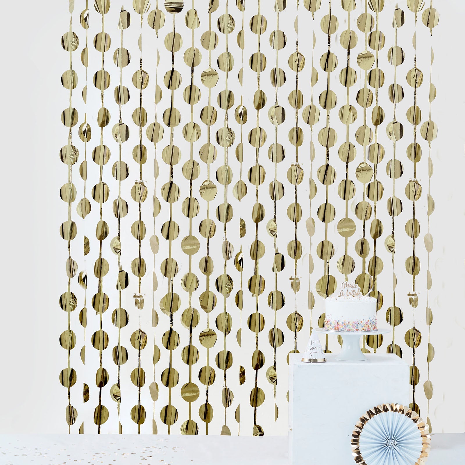 The Champagne Round Chain Foil Fringe Curtain can be used in various ways. Hang it behind a dessert table for a glamorous backdrop. It adds elegance to your cake display.