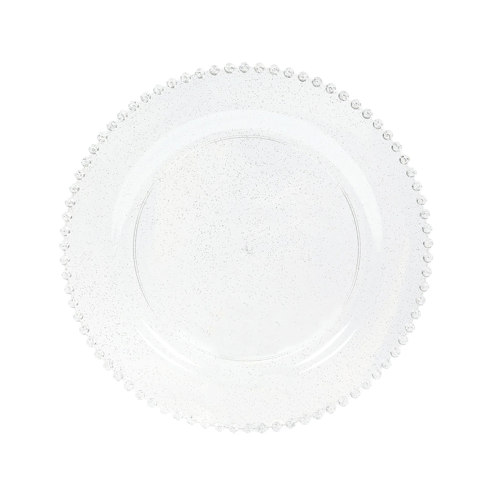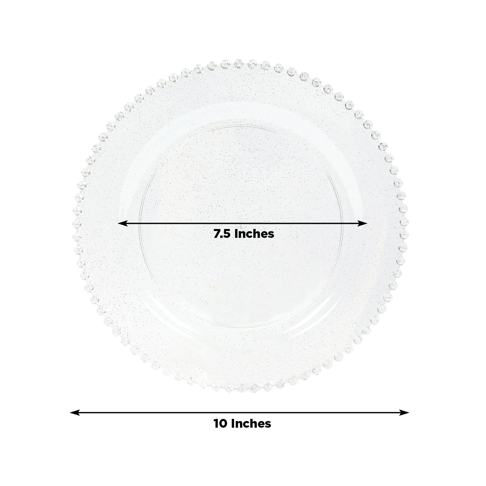 10-Pack Plastic 10" Round Dinner Plates in Clear Silver Glittered with Beaded Rim - Disposable Party Plates for Banquets & Festive Occasions