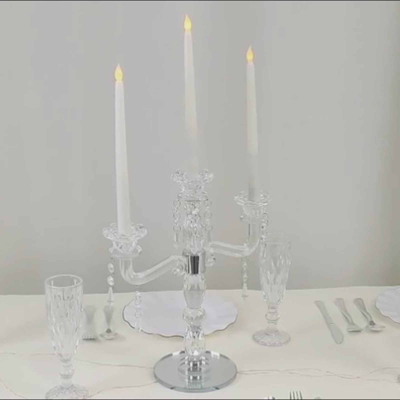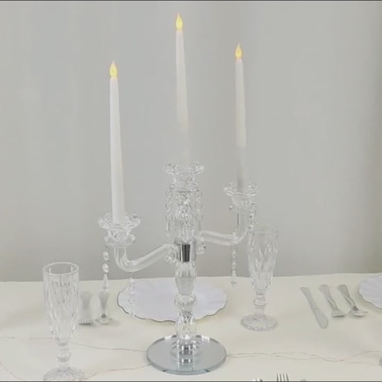 Add timeless elegance and charm to your event decor with our Crystal 3-Arm Candelabra Taper Candle Holder. Standing at 14" tall, this candelabra boasts a faceted cut glass design, with each arm designed to hold a taper candle. The addition of hanging crystal pendants enhances the glamour and sophistication of the piece, while the round mirror base adds depth and reflection, creating a captivating effect. Perfect for weddings, receptions, or any special gathering, this candelabra is a must-have for creating a luxurious atmosphere.