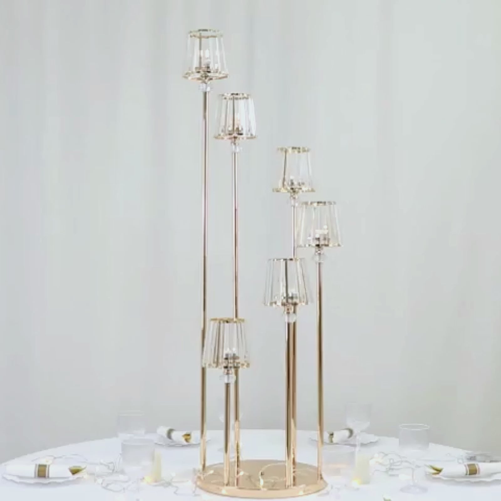 Incorporating a 6-arm crystal candelabra into your décor instantly enhances the atmosphere. Use it alongside Tabletop Centerpieces or place several candelabras along a dessert table for a dramatic effect. This cluster candle holder highlights key areas like buffet stations, reception tables, or entryways, drawing the eye with its tall, shimmering design. The combination of gold metal and crystal accents makes it versatile for formal events while complementing other décor pieces.