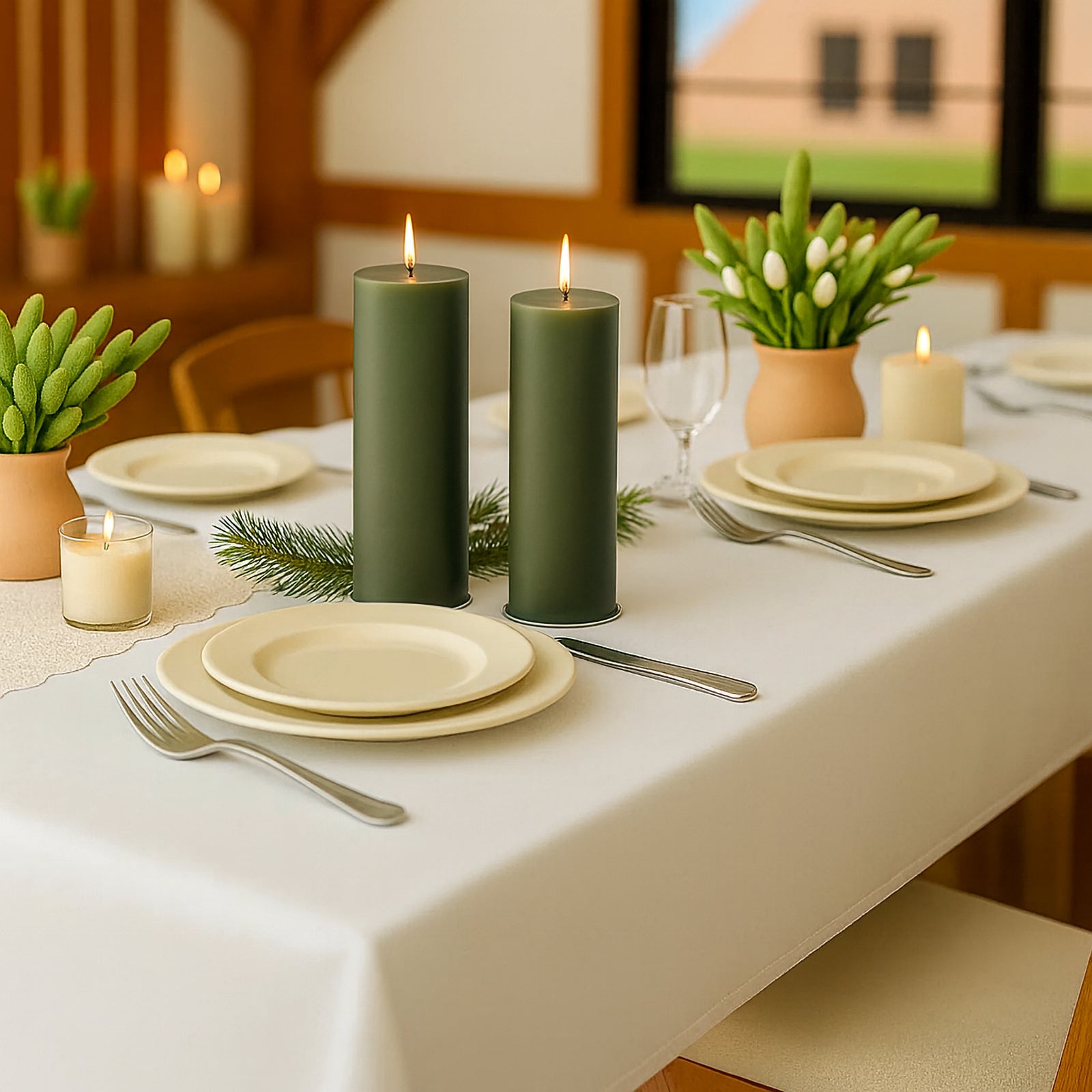 Décor styling ideas with dusty sage green pillar candles