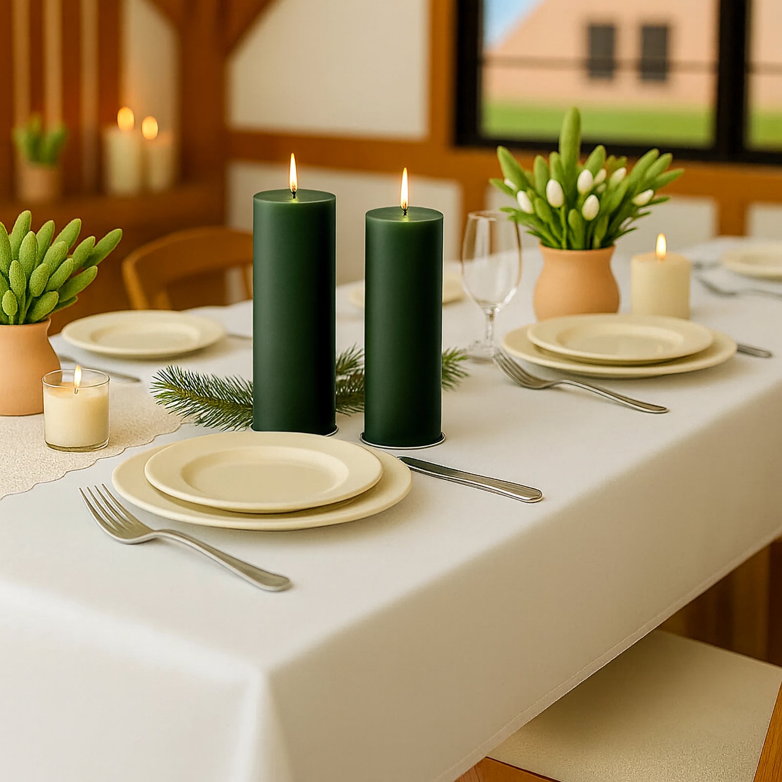 To softly spotlight displays, place candles behind risers so the glow skims textures and tiers. Pair emerald with ivory and blush for timeless contrast or with navy and gold for dramatic evening style. The shade adapts across seasons with minimal effort.