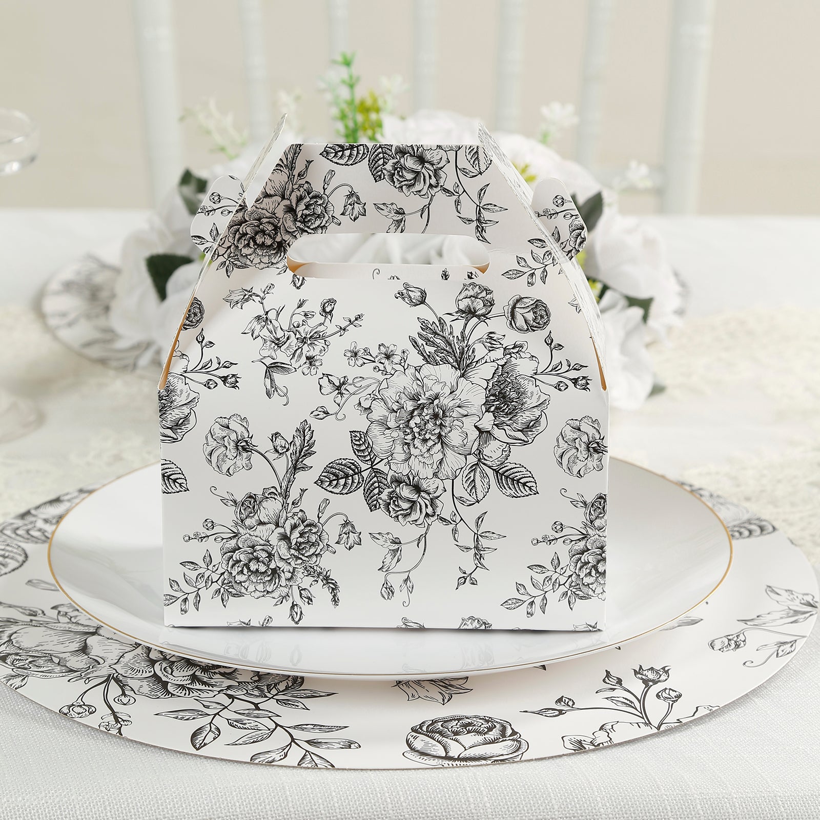 25 Pack Candy Treat Tote Boxes in French Toile Pattern - Matte Black and White Party Favor Gable Boxes, Cardstock Paper - 6"x3.5"x7"