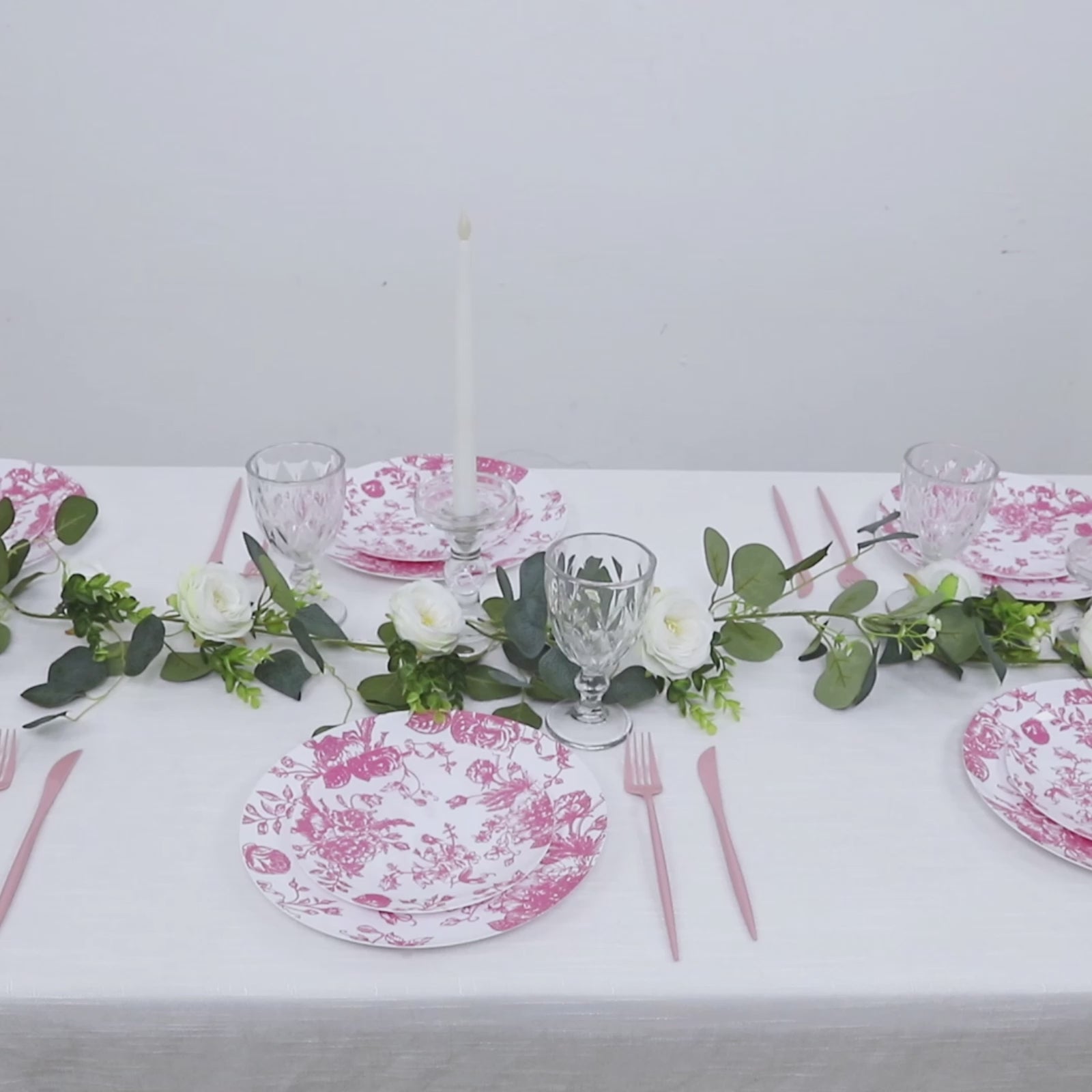 Elevate your event tableware with these French Toile Plates in pink and white. Each set includes 10 round plastic salad plates, crafted from sturdy hard plastic for both beauty and practicality. Measuring 7 inches, they’re the perfect size for salads, desserts, or appetizers. The intricate floral pattern in soft pink adds charm to your table without the hassle of traditional dinnerware.