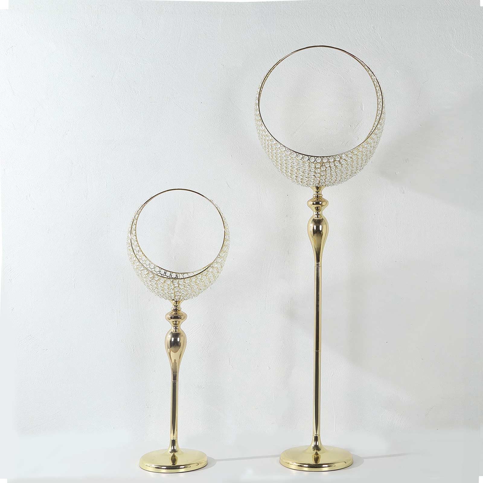 Gold Crystal Beaded Metal Flower Stand in Half Moon Basket Design, 4.5ft Tall Candle Holder Wedding Table Centerpiece Floor Stand with Round Stable Base