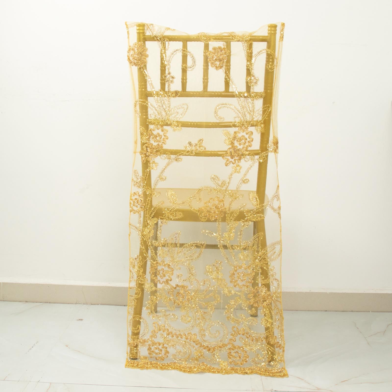 Chiavari chair slipcovers are an excellent choice for event decor. They provide an easy way to elevate the look of your seating. With the Gold Organza Floral Sequin Embroidered design, you can add a touch of elegance and sophistication to any occasion.