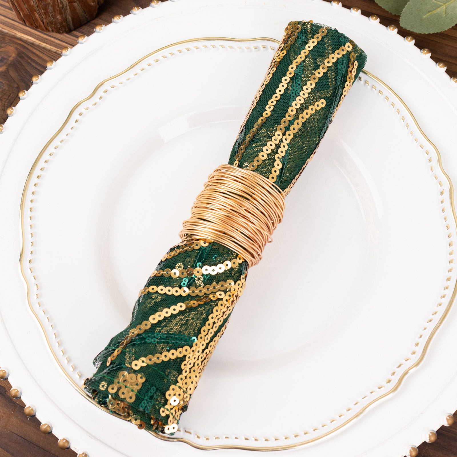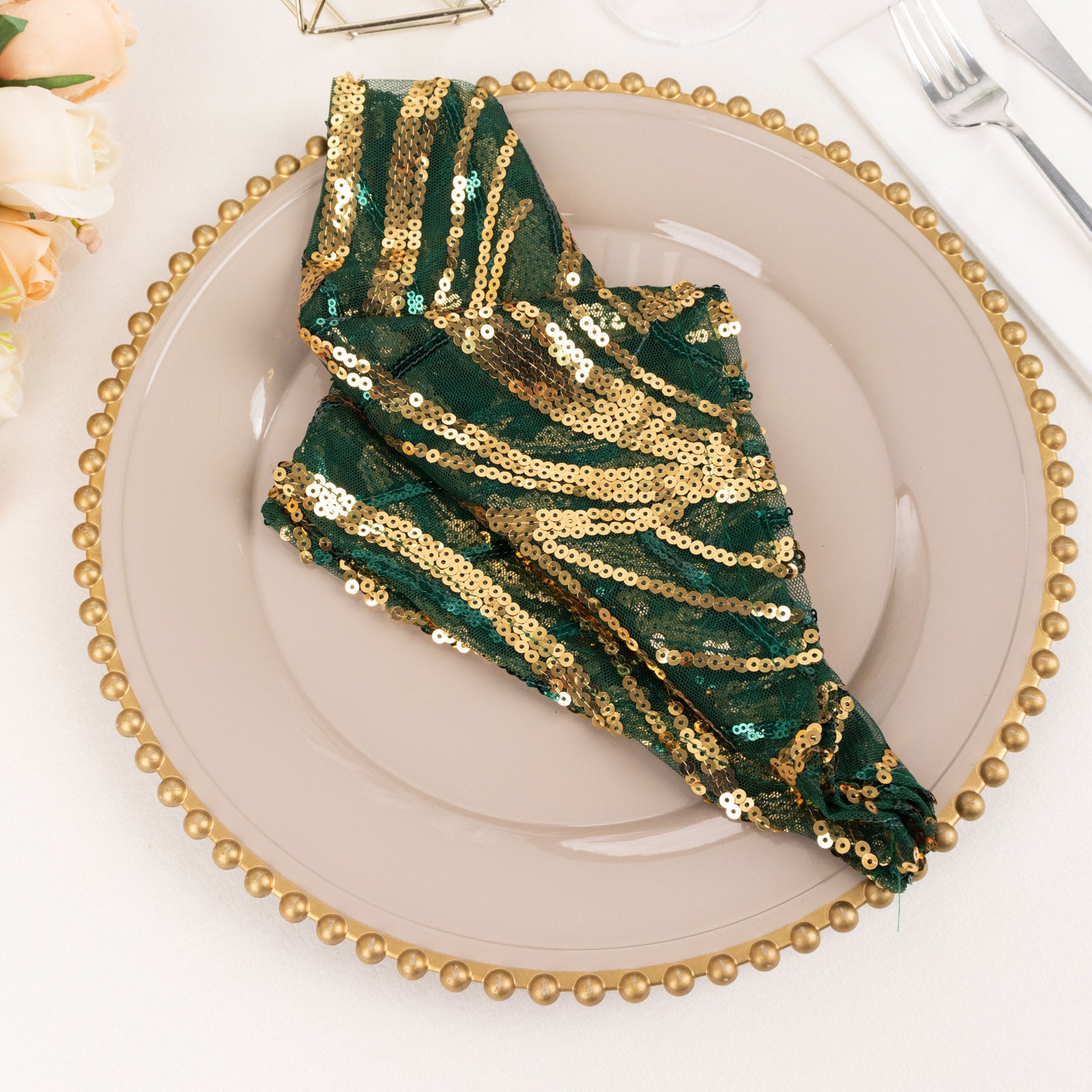 Hunter Emerald Green Gold Wave Embroidered Sequin Mesh Dinner Napkin, Reusable Decorative Napkin - 20"x20"