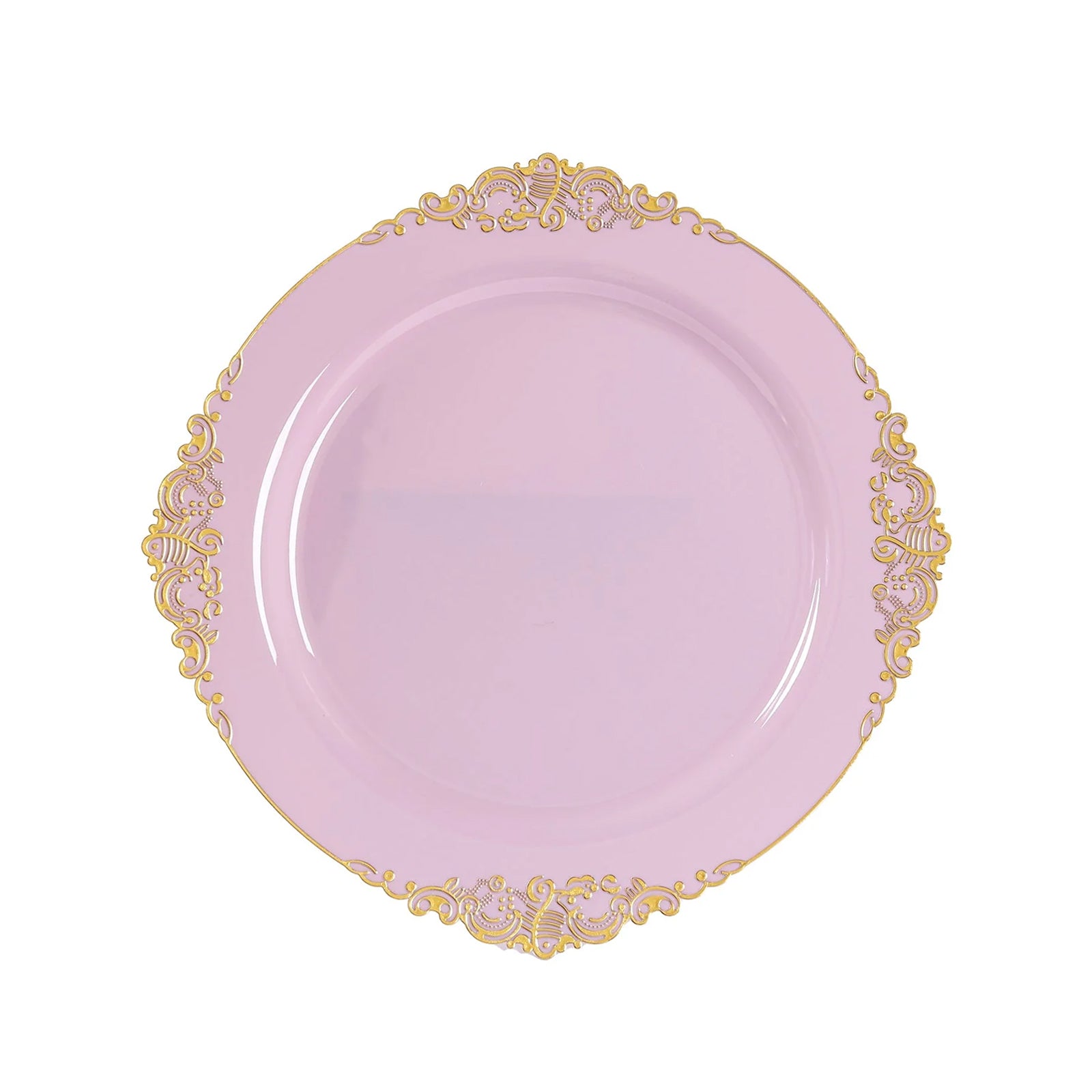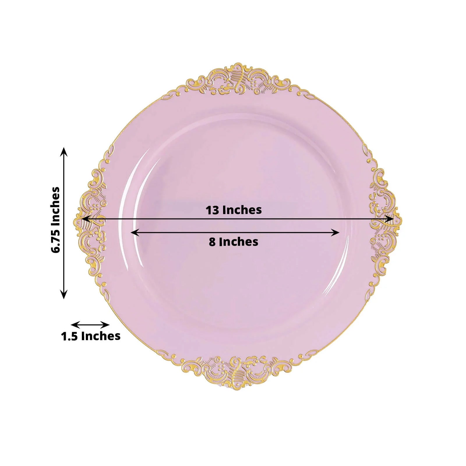 20-Pack Economy Plastic Charger Plates 13" Round Lavender with Gold Embossed Baroque Rim