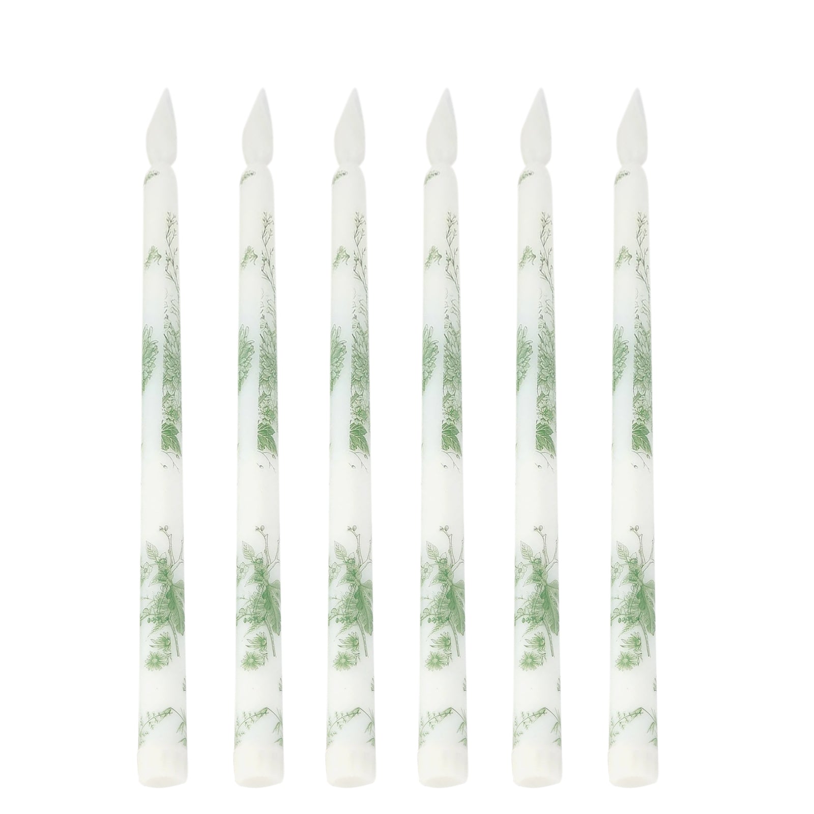 6-Pack 11" Flameless LED Taper Candles, Flickering Battery Operated – White & Sage Green French Toile Pattern