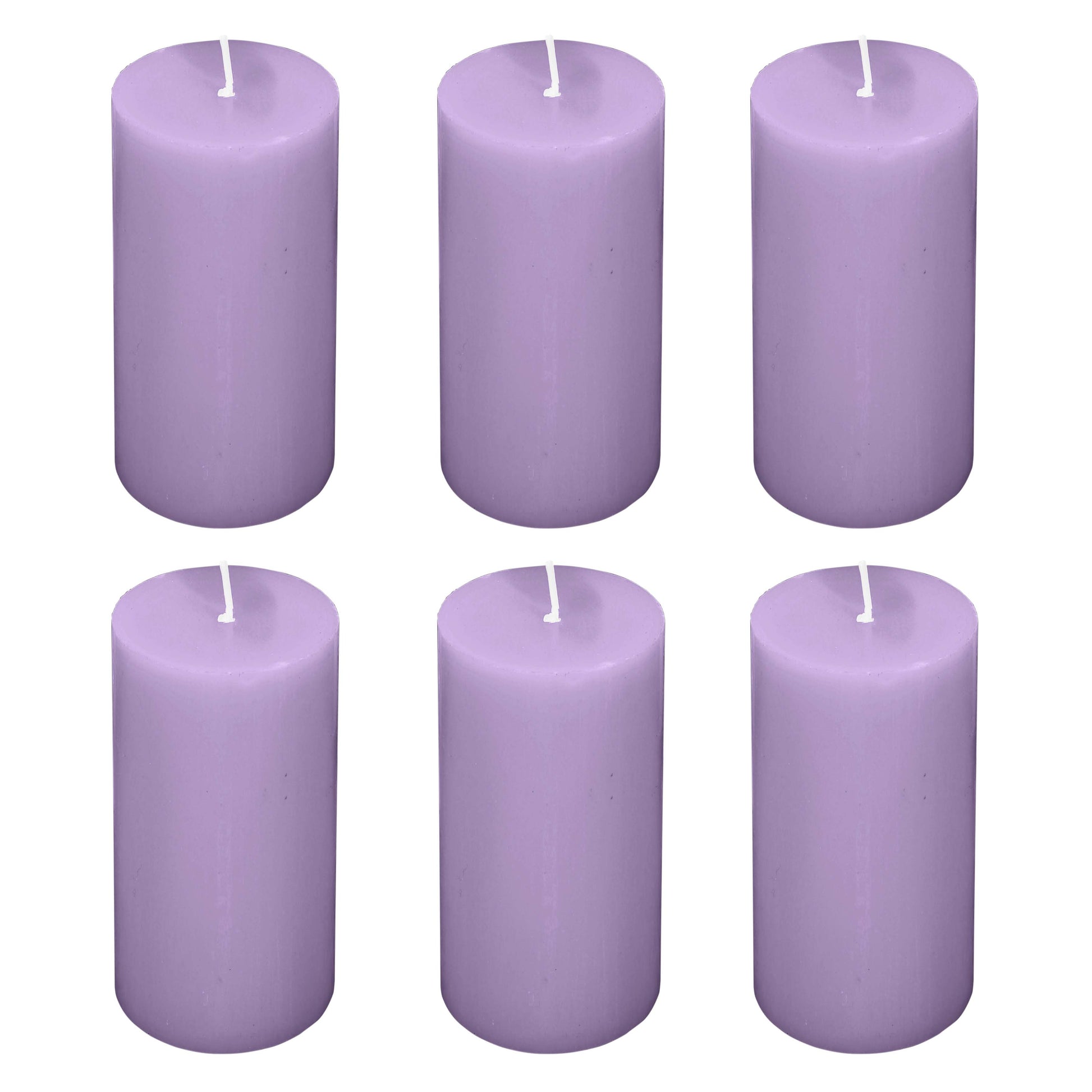 Set a charming and serene tone with this 6-pack of 3"x6" unscented dripless Lavender Lilac pillar candles from TCFLinen. Crafted from high-quality paraffin wax and cotton wicks, these candles provide a clean, drip-free burn that keeps your Table Linens spotless. The soft lilac hue brings whimsical appeal to weddings, bridal showers, and home décor alike.