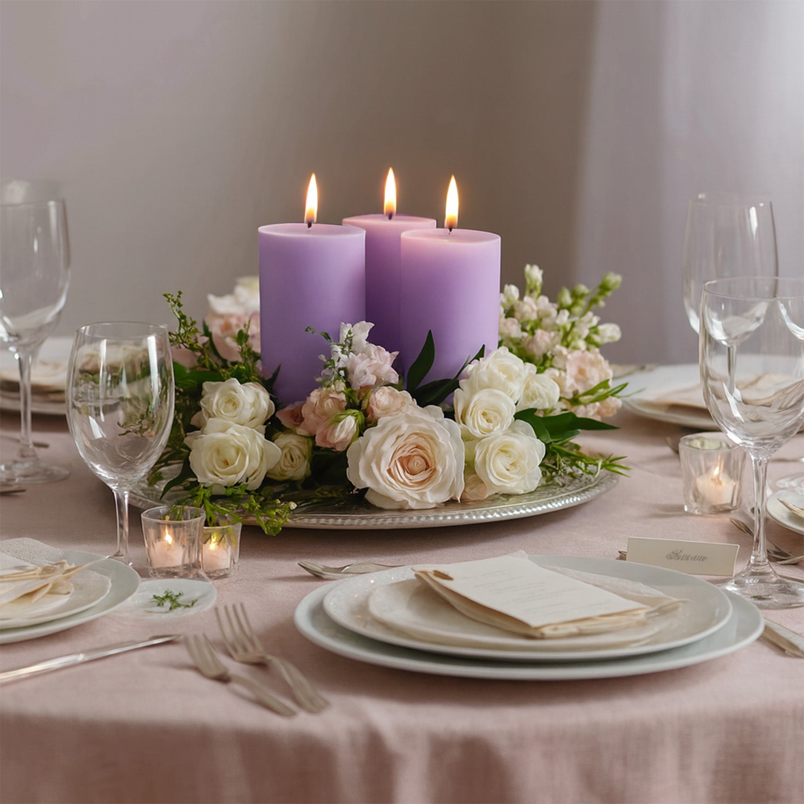Combine these candles with florals, soft drapery, and Candelabras for elegant vertical depth. Over pastel Tablecloths, their subtle tone creates a warm, inviting presence that complements romantic and spring themes.