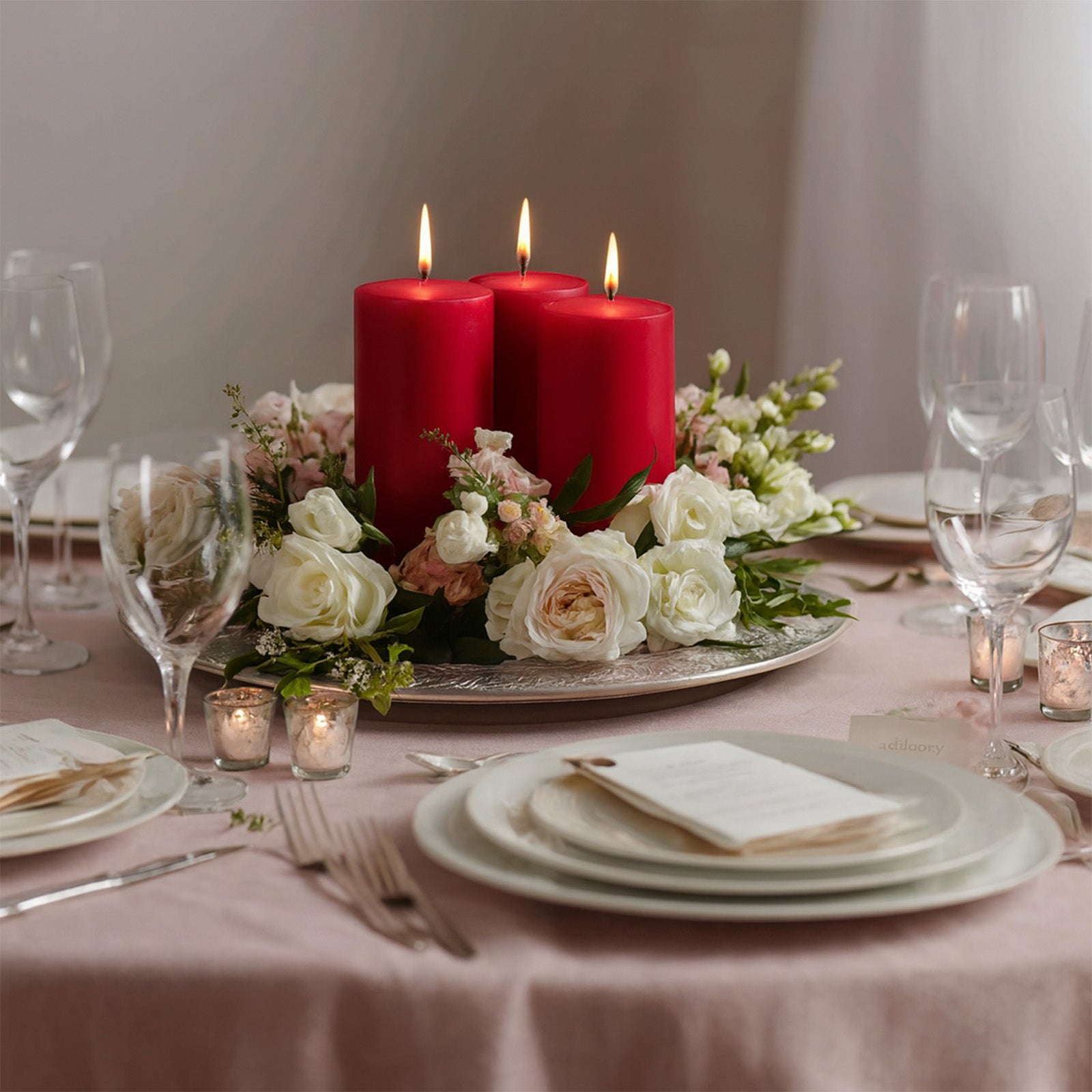 Blend candlelight with warm fixtures from Lighting and Candles to add layers that read beautifully in photos. For cohesive seating, pair pillars with crisp Tablecloths, then finish with greenery or metallic holders for texture. Red pillars also work seamlessly with winter palettes, velvet accents, and modern black-and-gold schemes.
