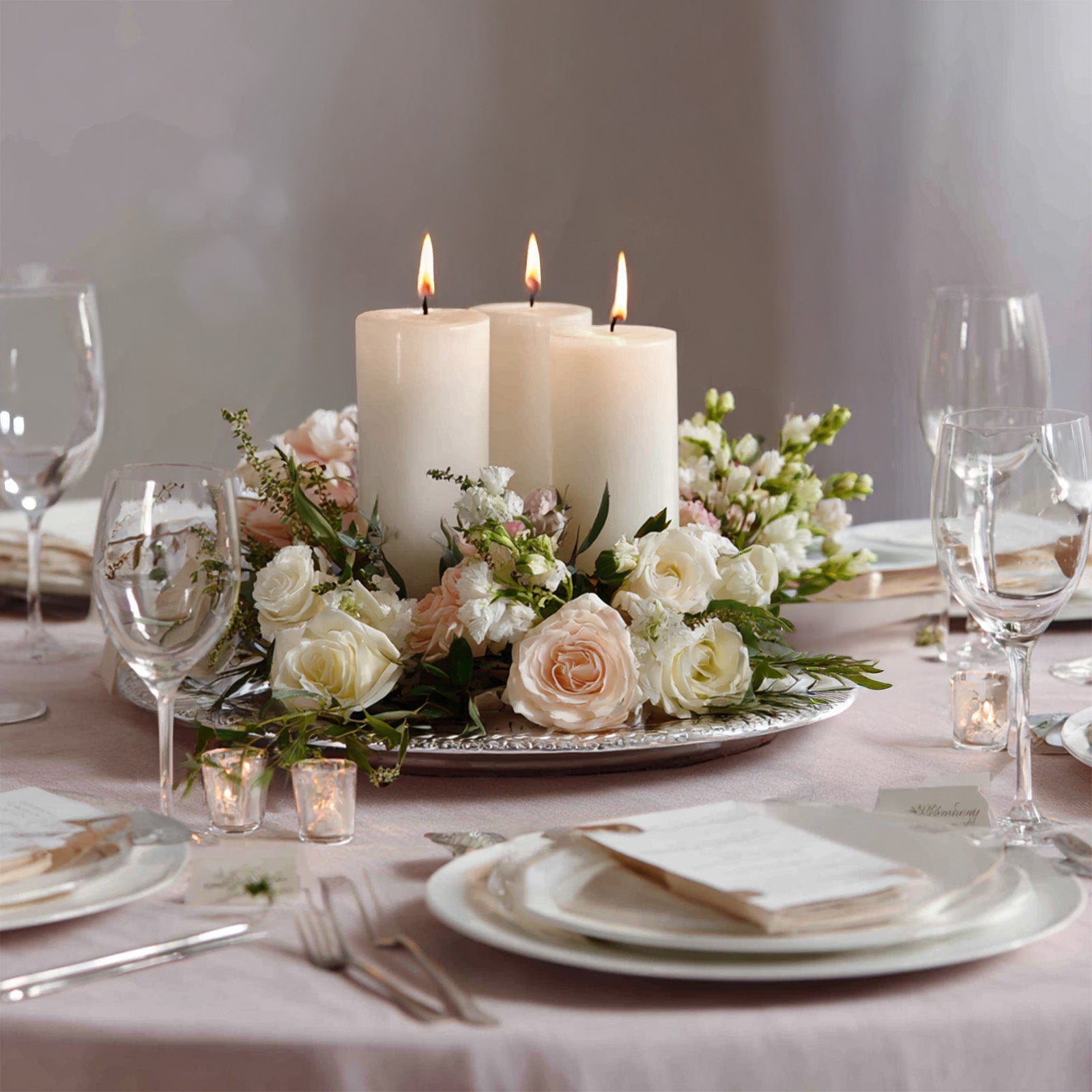 Over simple Tablecloths, accent with greenery, blooms, or neutral fabrics for timeless contrast. Layer these pillars with metallic holders or Candelabras for structured height and drama while keeping the design clean and cohesive.