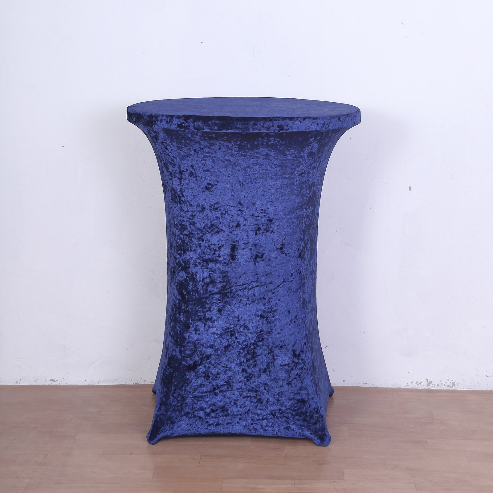 The Navy Blue Crushed Velvet Spandex Fitted Round Highboy Cocktail Table Cover is built to last. Crafted from high-quality spandex, it resists stains and spills. This makes it ideal for any occasion, from casual parties to formal events.