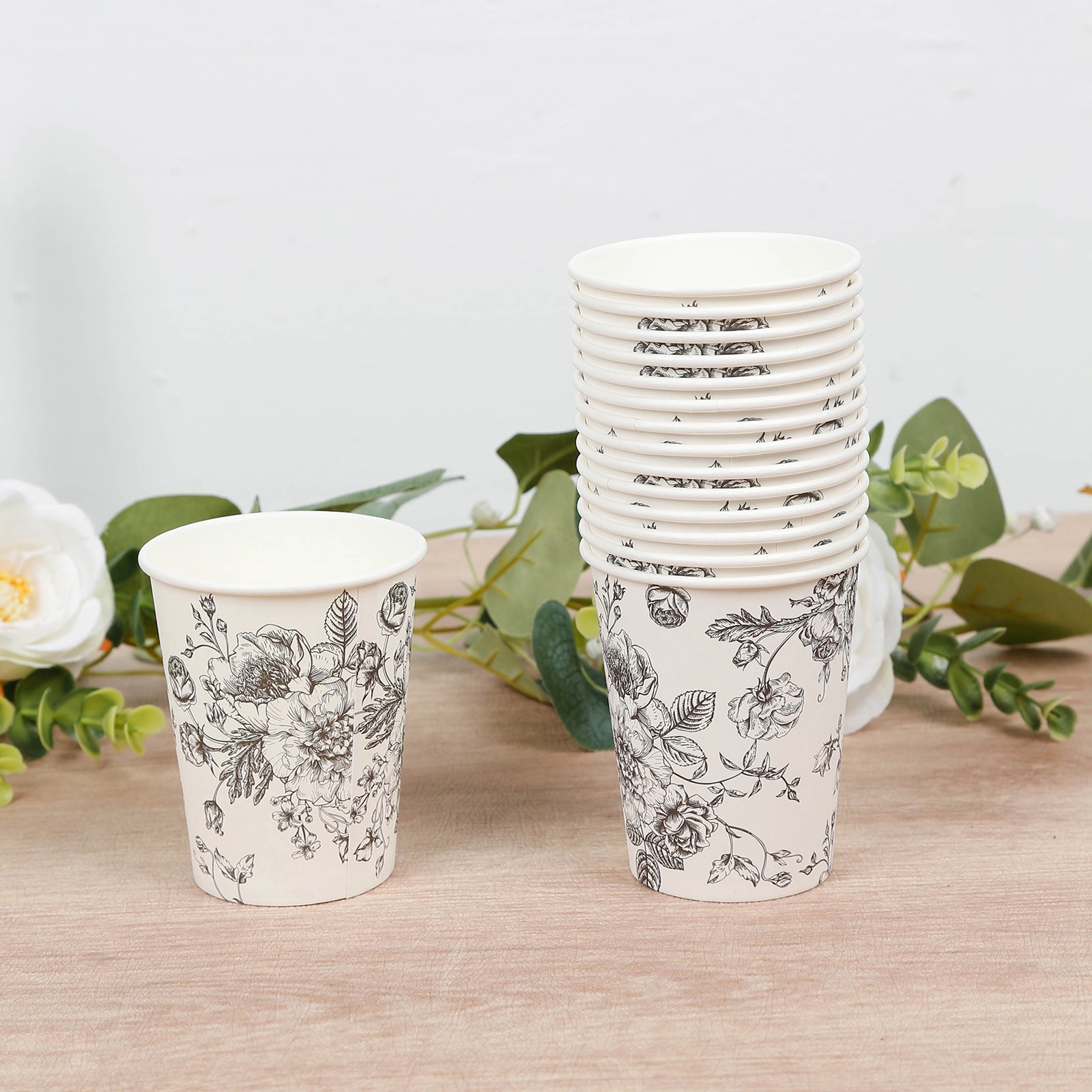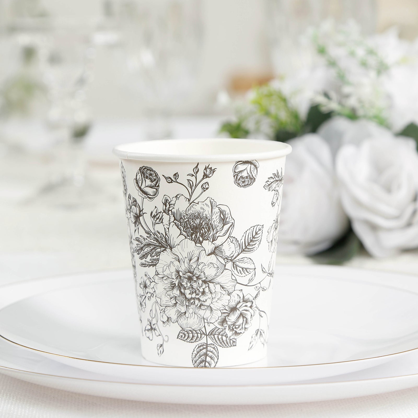 50-Pack Paper Cups in White with Black French Toile Print - Stylish Disposable Floral Party Cups for Weddings & All Purpose Use 9oz