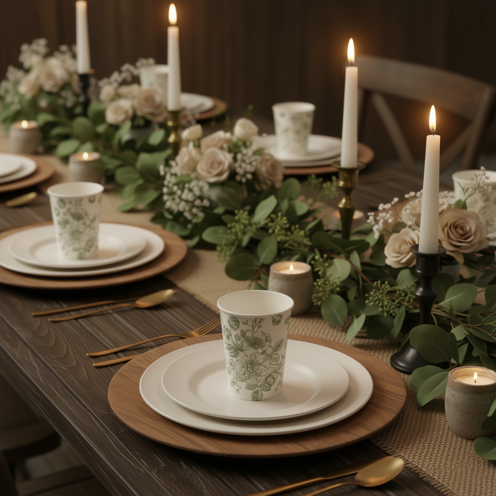 Planning a celebration is about striking the perfect balance between practicality and visual appeal. These sage green and white cups are the ideal addition to your Disposable Cups collection, offering versatile use for hot and cold drinks. Their charming floral pattern pairs beautifully with Table Runners and soft-toned décor for a cohesive aesthetic. Lightweight yet sturdy, they make serving guests effortless while maintaining an upscale presentation throughout your event.