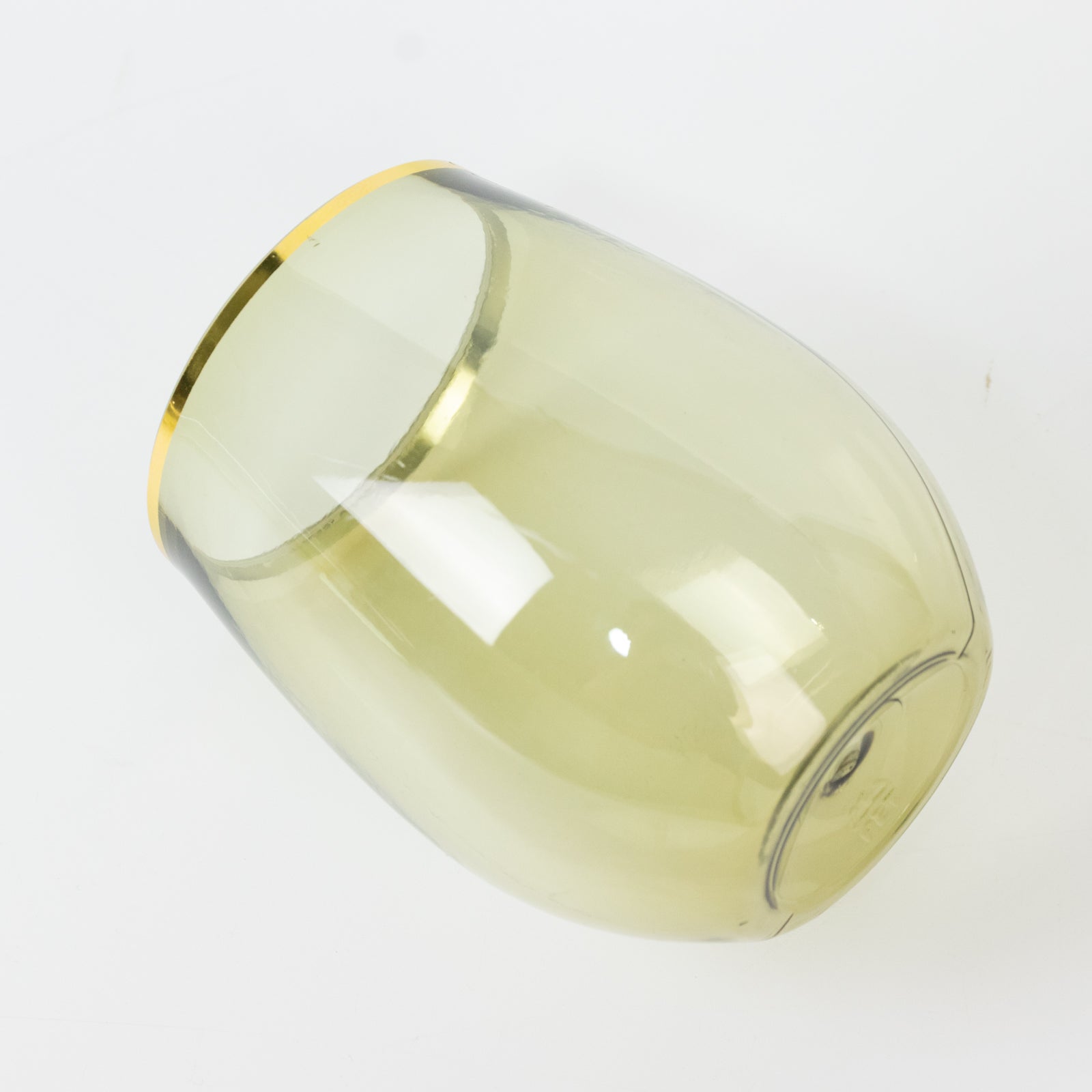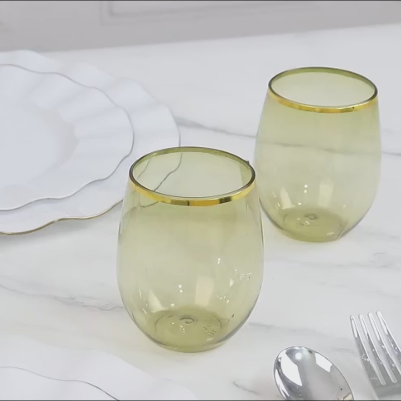 Transparent Dusty Sage Green Stemless Plastic Wine Glasses with Gold Rim