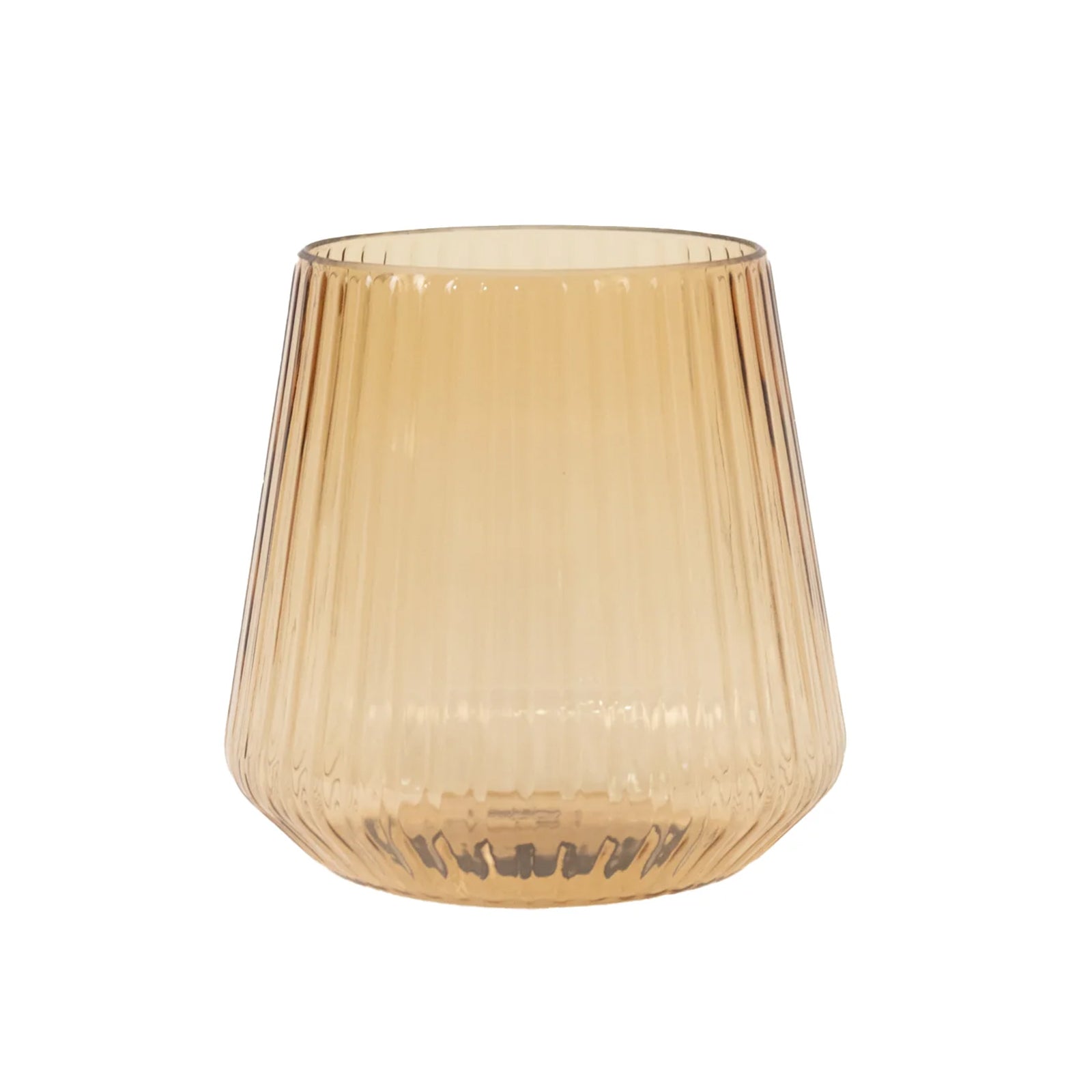 Set a warm and festive tone at your events with this 12-pack of Transparent Amber Gold plastic stemless wine glasses from TCFLinen. Each 12oz tumbler is crafted from heavy-duty plastic and features a ribbed design for a secure grip and modern look. These reusable wine tumblers are shatterproof and dishwasher-safe, providing safe and stylish drinkware for any indoor or outdoor occasion.