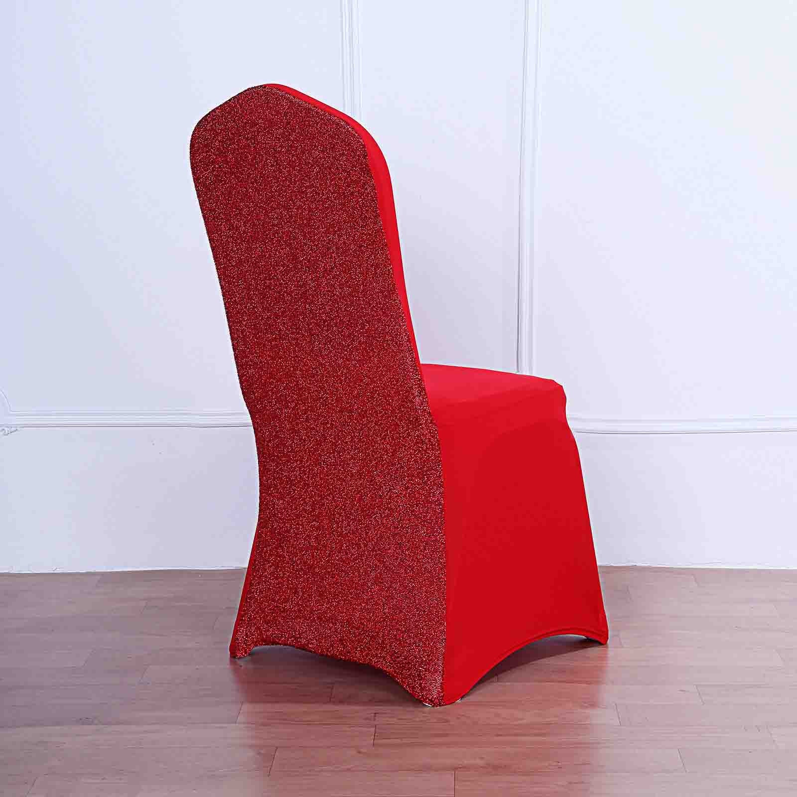 Red Spandex Stretch Banquet Chair Cover, Fitted with Metallic Shimmer Tinsel Back