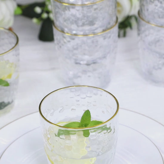 The timeless clear plastic and gold accents pair beautifully with a variety of event themes. Use them to complement your tablescape or bring a touch of luxury to your bar area. The elegant hammered texture adds visual interest, creating an upscale feel without the fragility of glass.