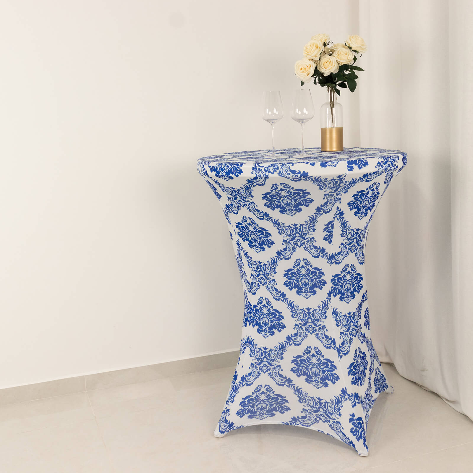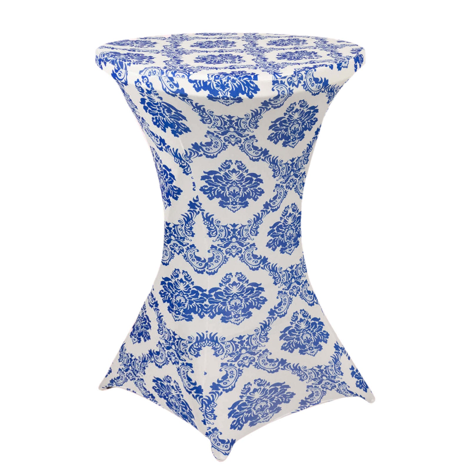 Royal Blue Damask Cocktail Spandex Table Cover, 30" Round Highboy Stretch Fitted Tablecloth