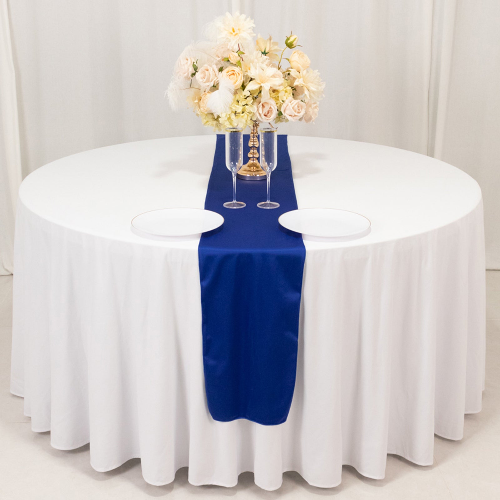 The versatility of the royal blue scuba polyester table runner opens the door to endless décor possibilities. Whether you're aiming for a timeless, classic look or a more contemporary style, this runner serves as the perfect base for your tablescape. To create a cohesive, elegant setup, pair it with complementary tablecloths in soft shades like white, ivory, or champagne.