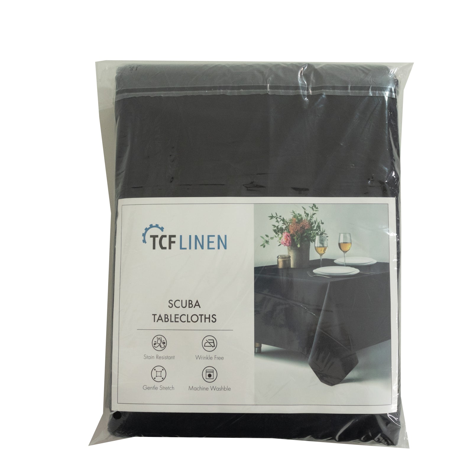 This Black Scuba Rounded Corner Rectangular Tablecloth delivers durability and dramatic style. Crafted from 100% scuba polyester with a 220 GSM weight, the 90"x156" seamless design resists wrinkles and stains for a flawless finish. Rounded corners give it a tailored fit, preventing excess fabric from gathering at the edges, while hemmed edges add refinement.
