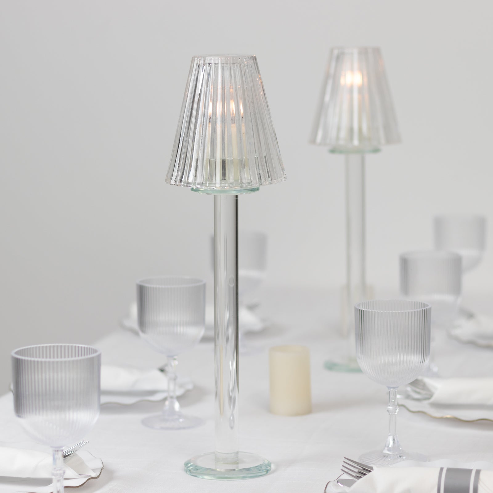Set of 2 Clear Crystal Glass Candle Holders – 17" Elegant Ribbed Vintage Table Lamp Design