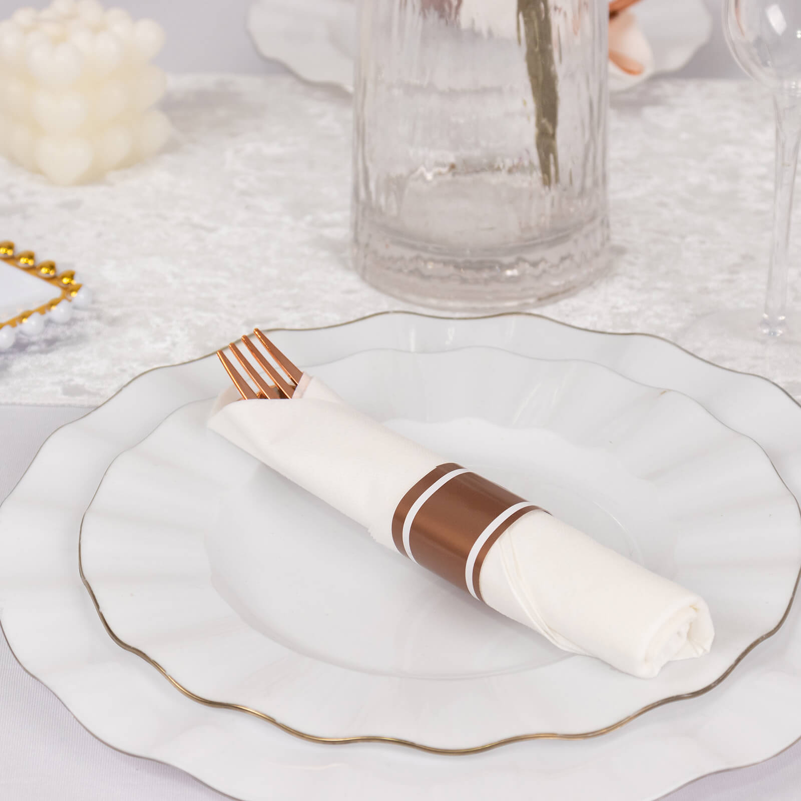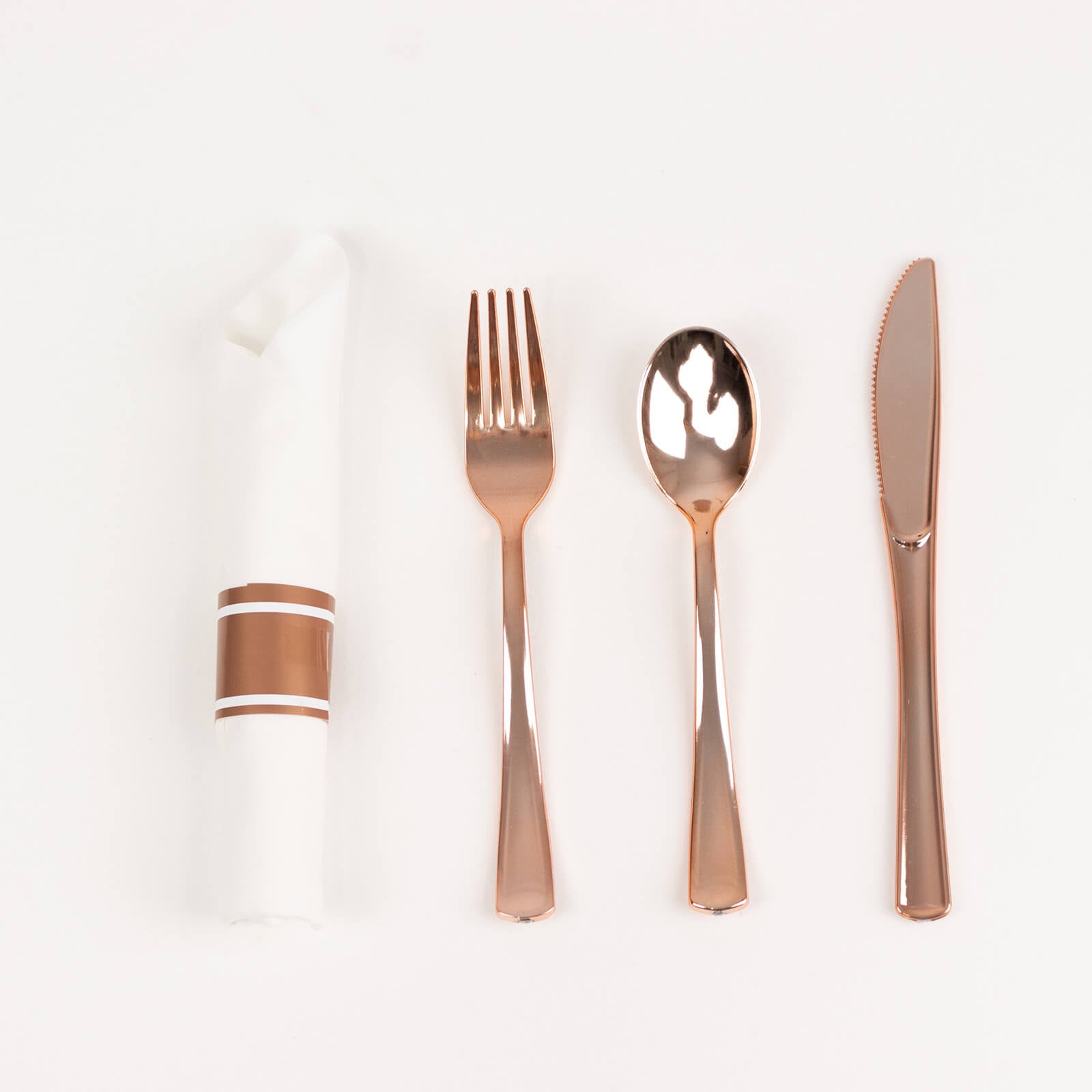 Set of 24 Pre Rolled Plastic Silverware Sets in Rose Gold with White Paper Napkins, Disposable Wrapped Cutlery Set - 24 Napkins, 24 Spoons, 24 Forks and 24 Knives