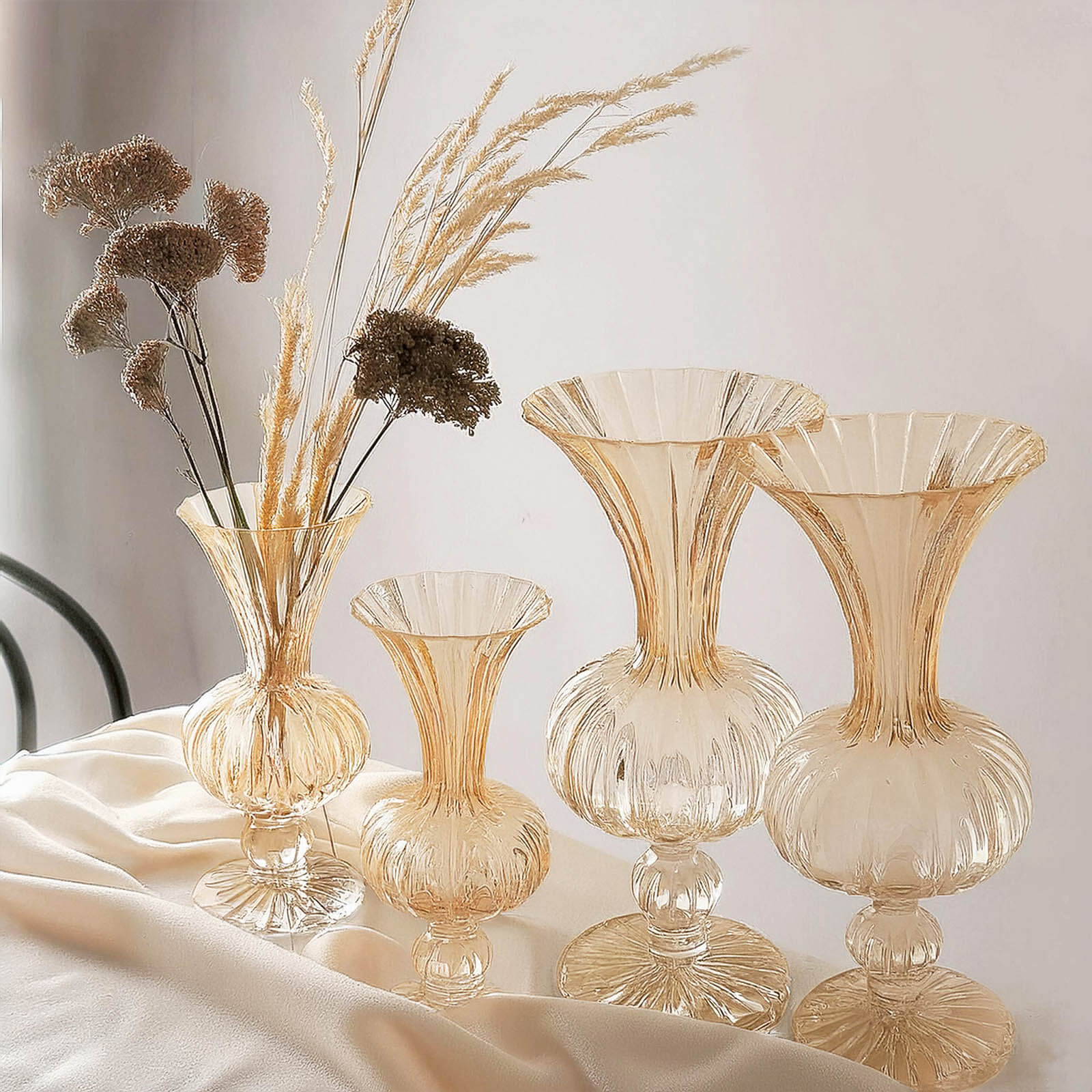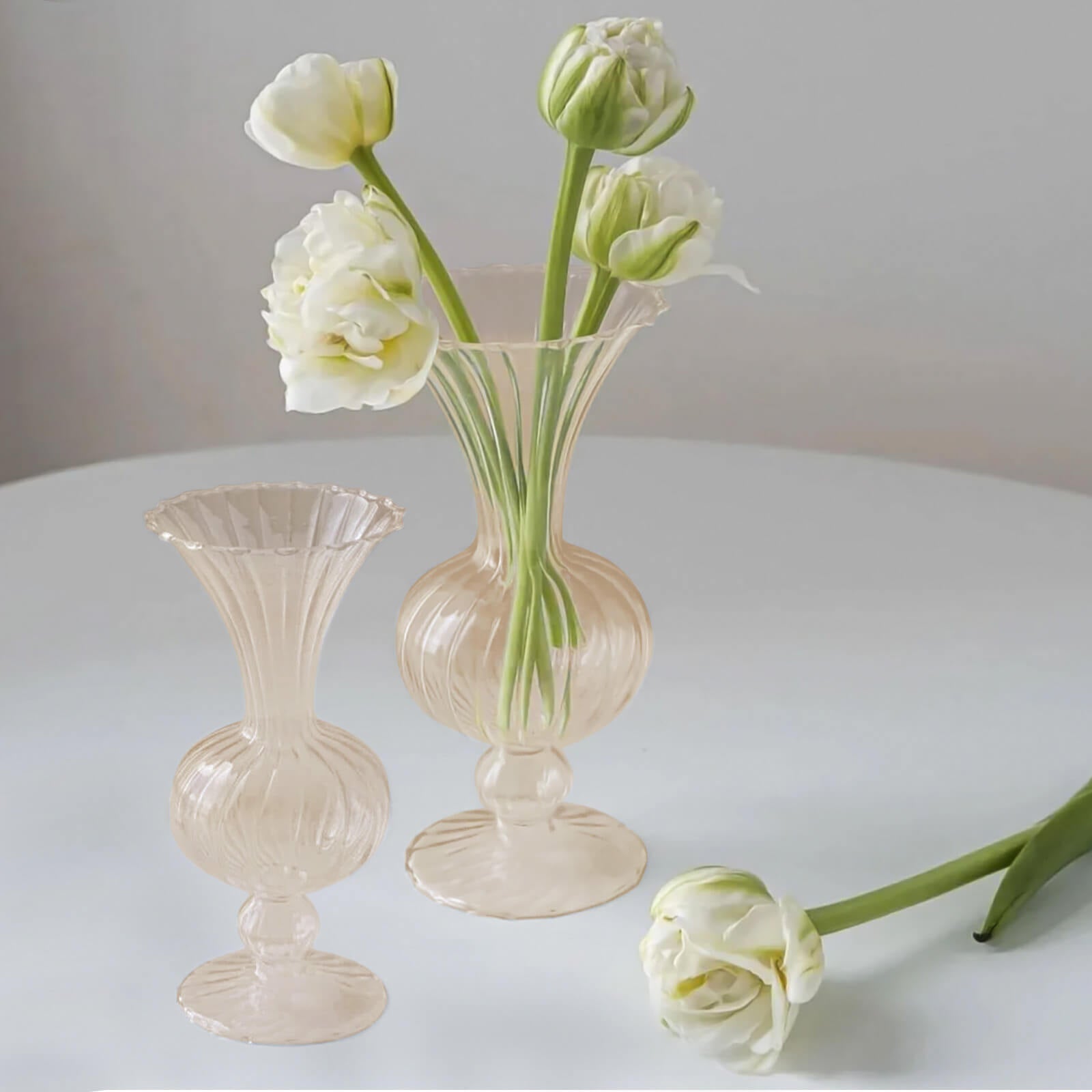 Set of 4 Amber Gold Vintage Nordic Glass Flower Vases with Petals Texture, Transparent Bud Vase Centerpiece Floral Arrangements - 7",9"