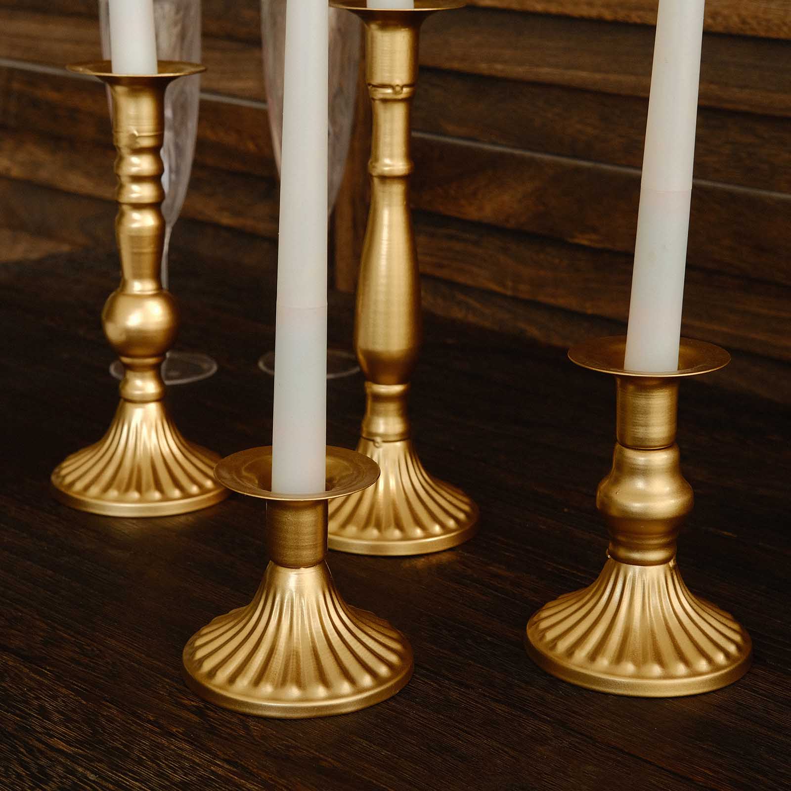Set of 4 | Gold Baroque Metal Taper Candle Holder Centerpieces, Vintage Candlestick Stands - 9", 8", 5", 3"