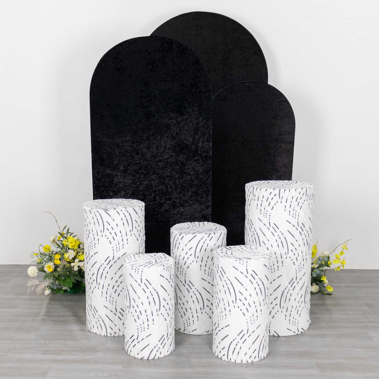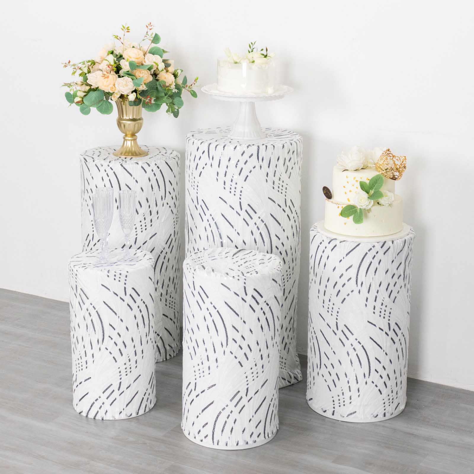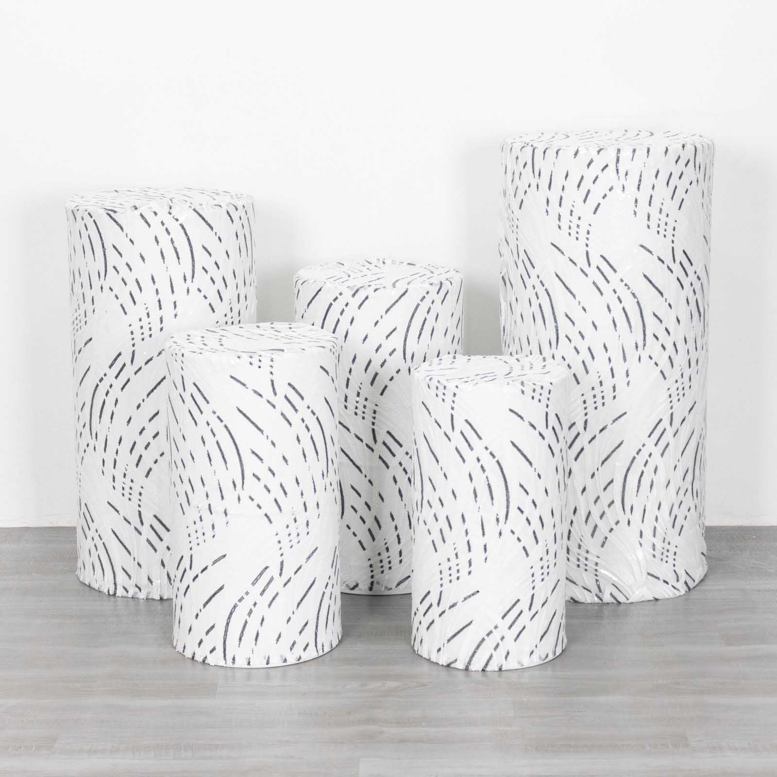 Incorporating White Black Wave Mesh Cylinder Pedestal Prop Covers into your decor opens up various design possibilities. Pair them with elegant centerpieces for a cohesive look. This combination creates a visually stunning focal point for your guests.