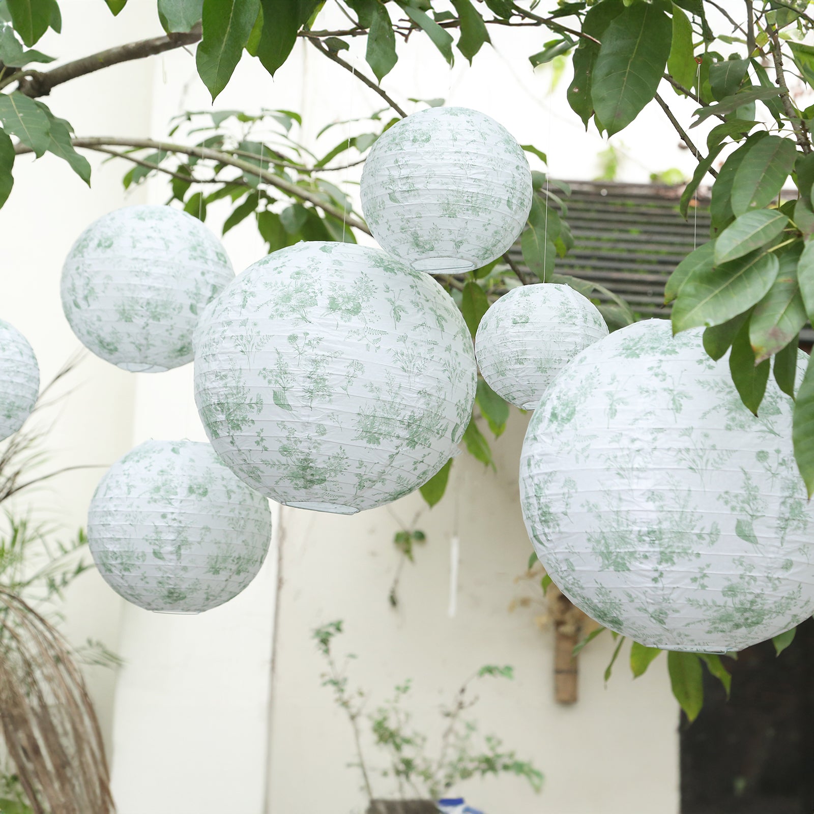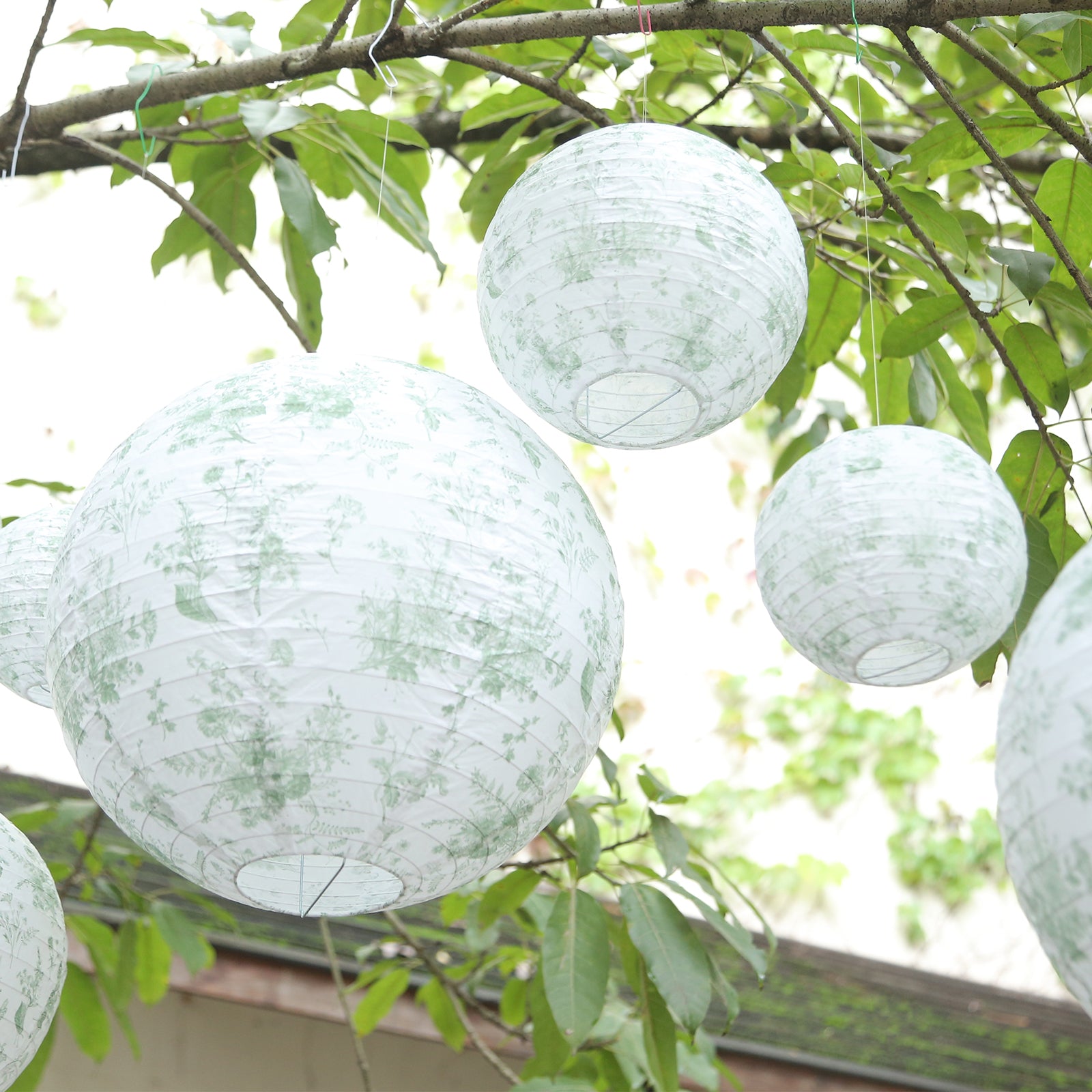 Set of 8 White Sage Green Hanging Chinese Lanterns in French Toile Floral Pattern, Festival Paper Lanterns - 6",8",10",14"