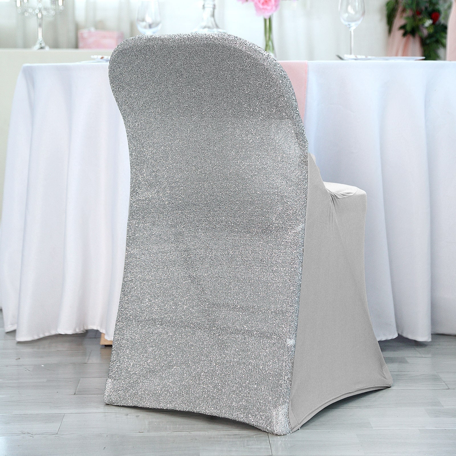Silver Spandex Stretch Folding Chair Cover, Fitted Chair Cover with Metallic Shimmer Tinsel Back