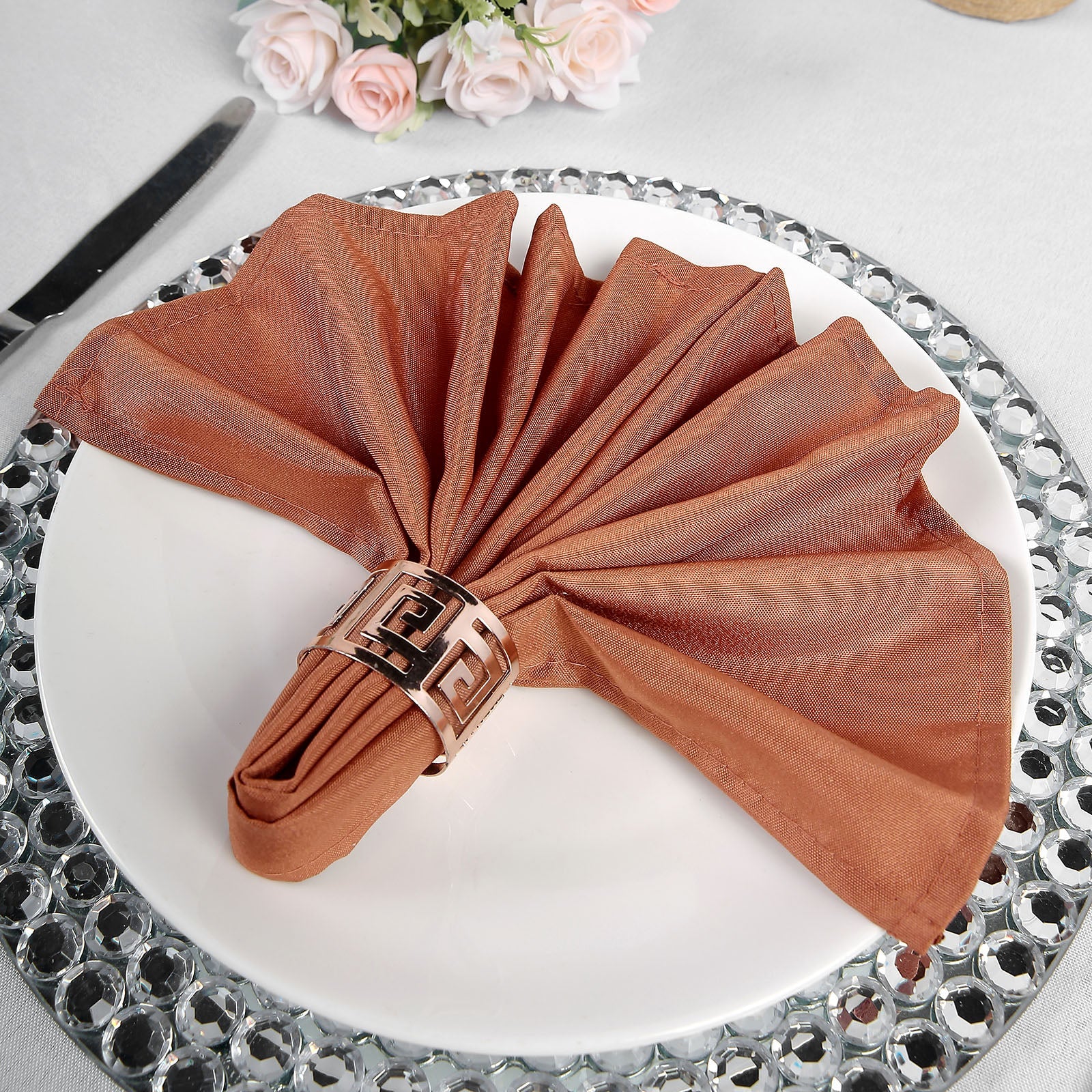 You can fold these napkins into creative shapes or use napkin rings for added flair. Their terracotta hue pairs beautifully with other colors, making them suitable for any theme. Mix and match with satin and rosette tablecloths for a stunning display.