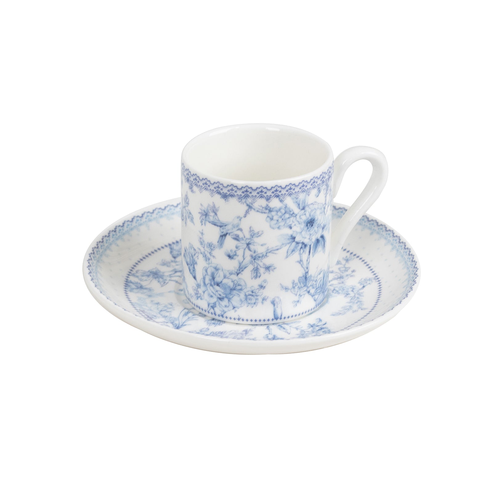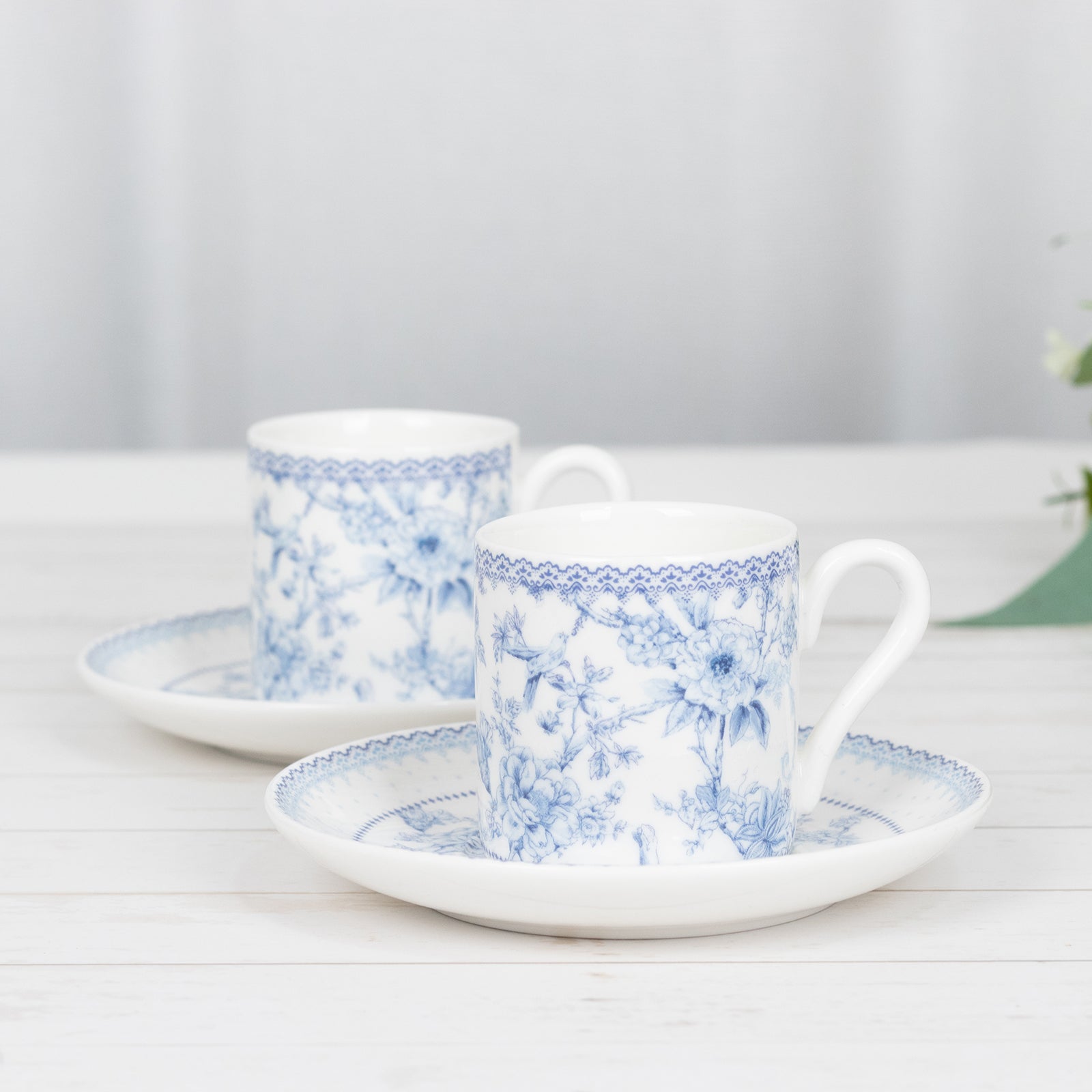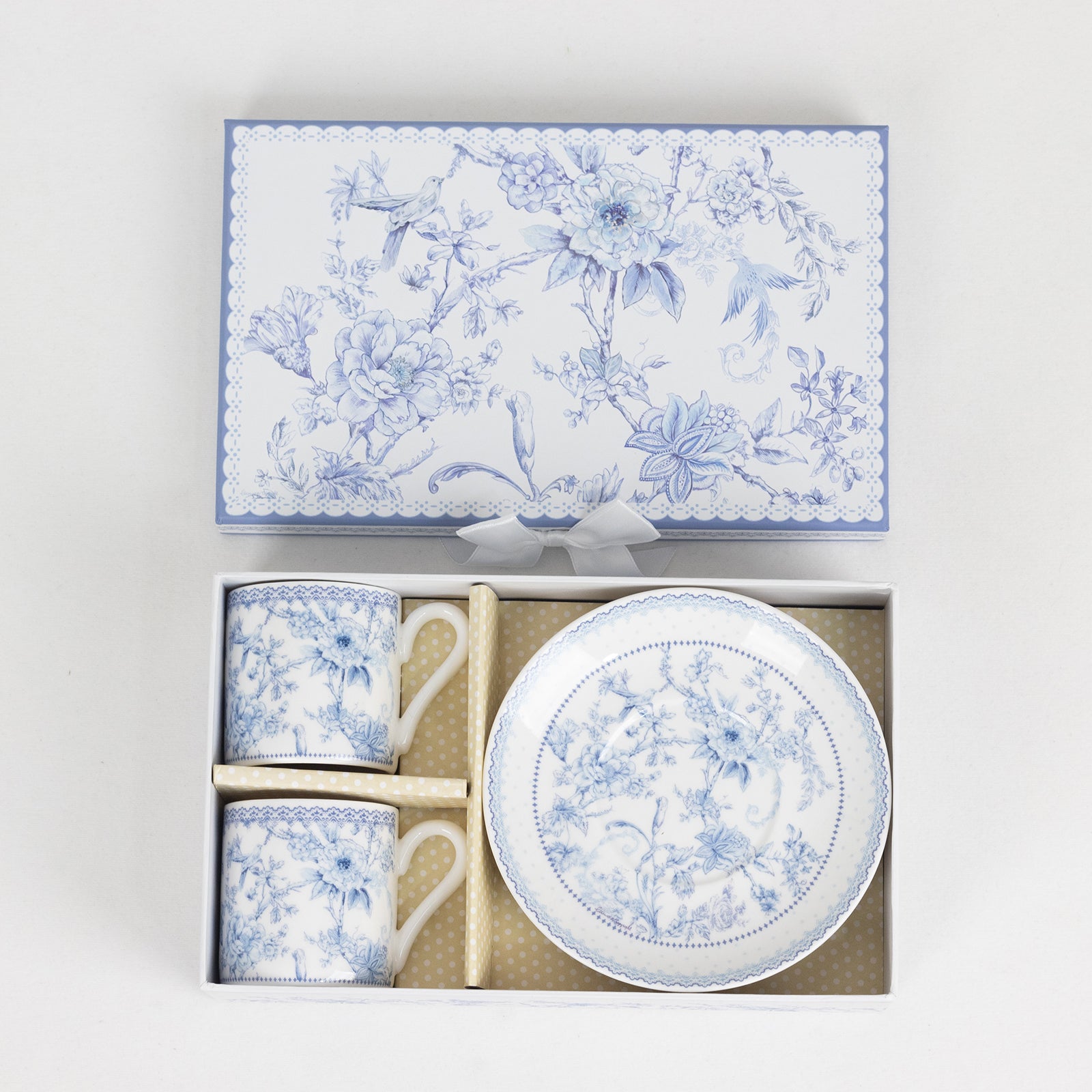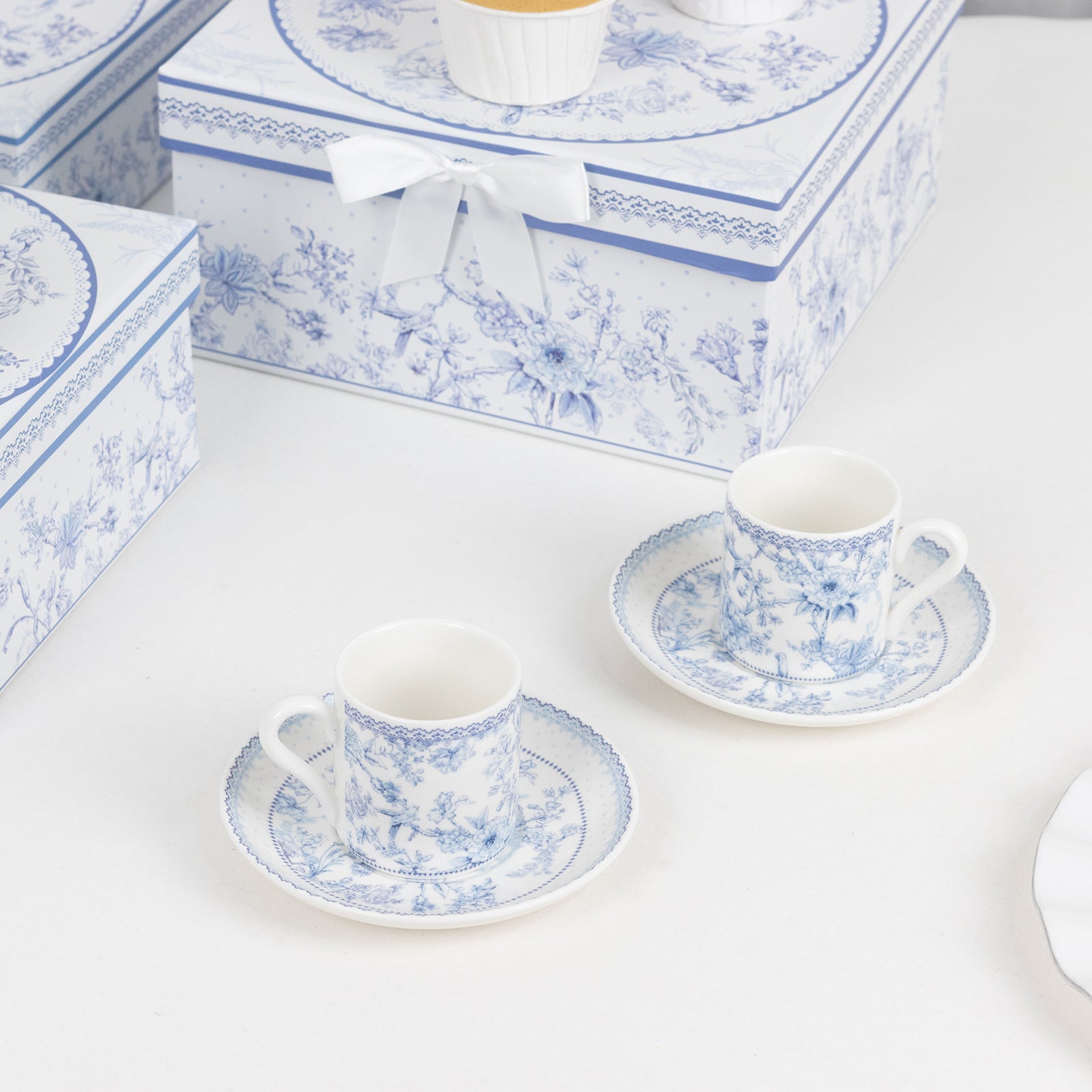 White Blue French Toile Bridal Shower Gift Set, Set of 2 Porcelain Espresso Cups and Saucers with Matching Keepsake Box
