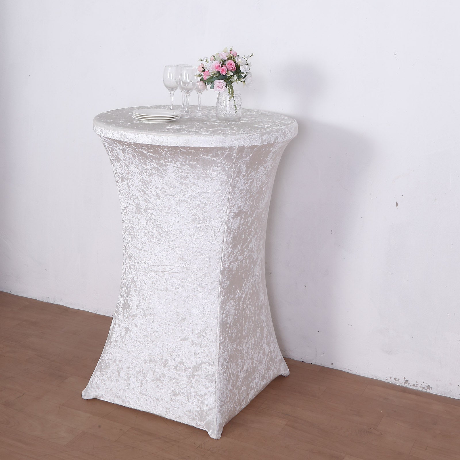 The White Crushed Velvet Spandex Fitted Round Highboy Cocktail Table Cover is incredibly versatile. It suits a wide range of events, from elegant weddings to lively cocktail parties. Its sophisticated design allows it to blend seamlessly with any theme or décor style.